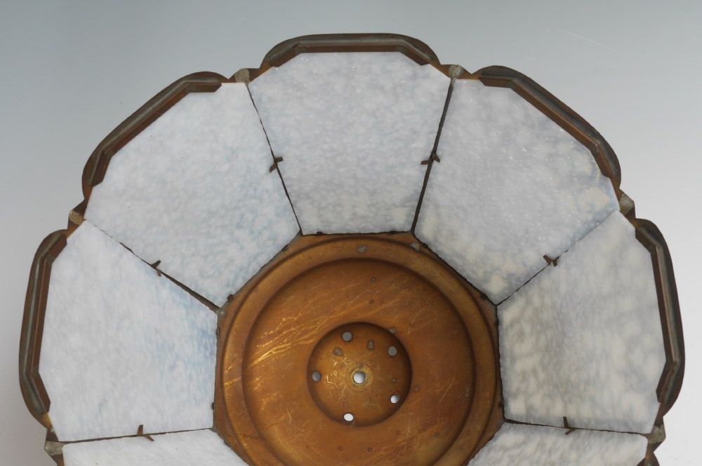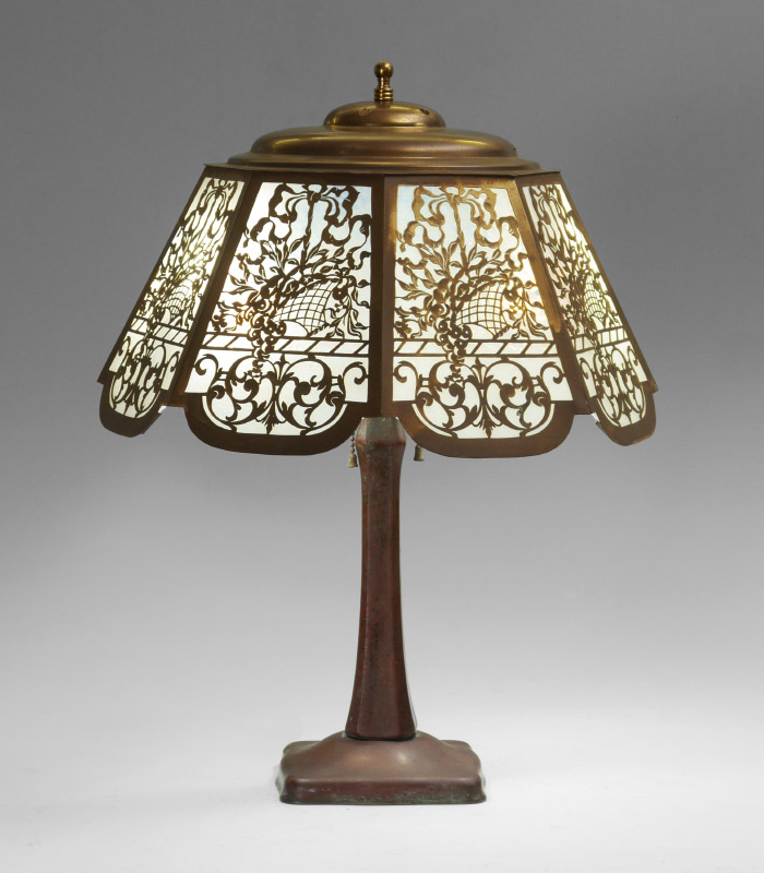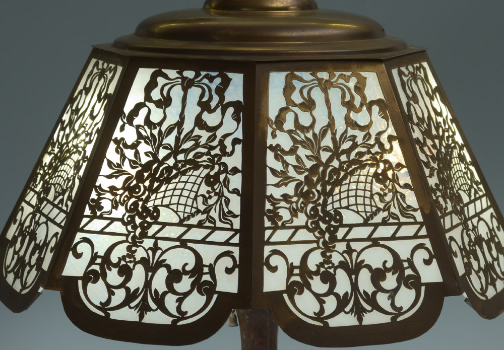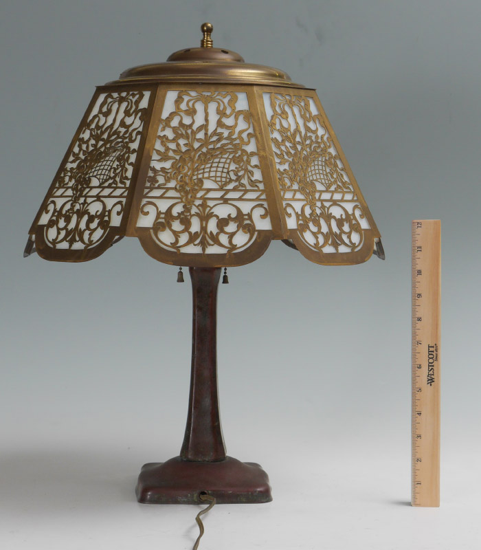 HANDEL BASE FILIGREE SLAG GLASS LAMP: Patinated cast metal base marked Handel, original double socket fixture, measures 20'' h. x 6'' square. Sold with an unrelated brass filigree shade with 8 opalescent white glass panels. Shade overall 9'' h. x 15 3/4''.