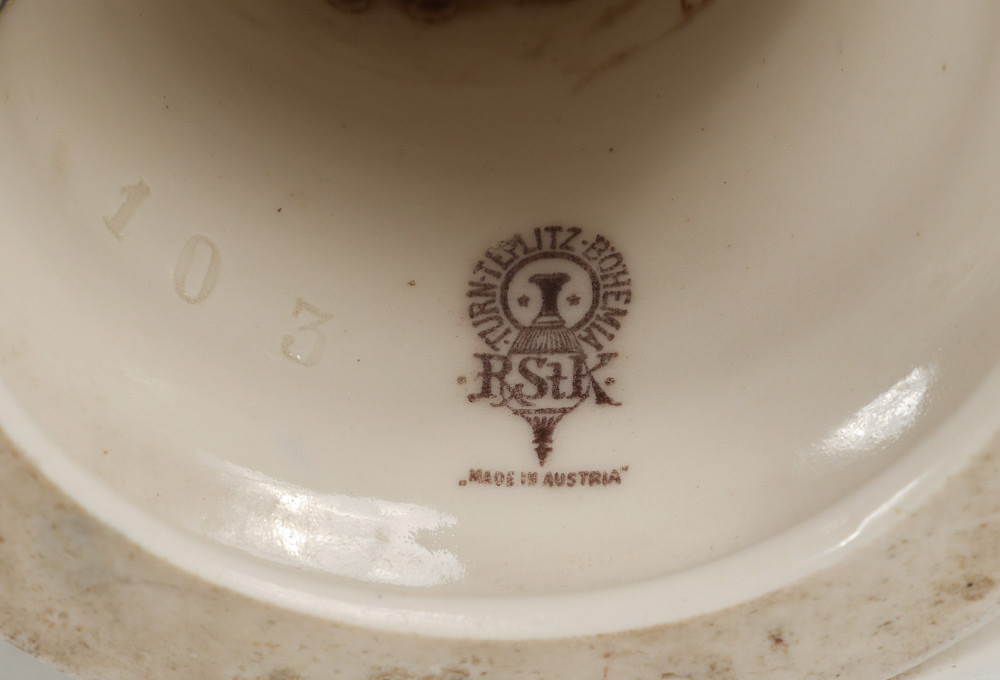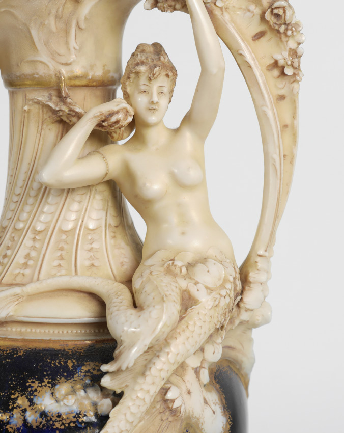 TURN TEPLITZ FIGURAL MERMAID EWER: Porcelain ewer or pitcher, hand with figure of double tailed mermaid, cobalt blue body with gilt spider webs and floral motifs, marked on base with Riesser, Stellmacher & Kessel mark, impressed 201. Overall measures 19'' h. x 7 1/2''.