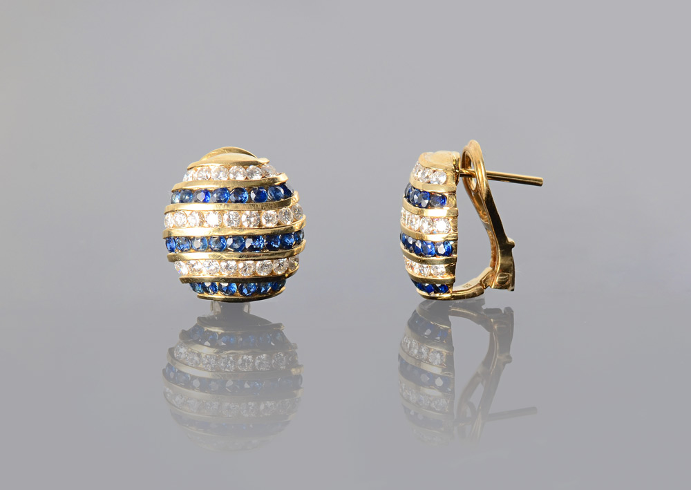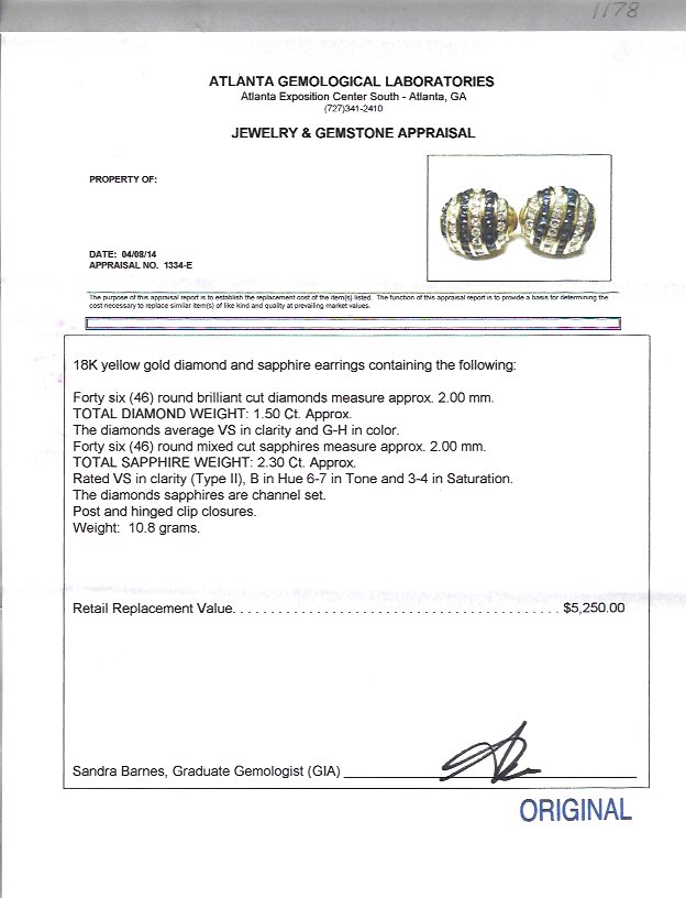 18K EARCLIPS W/3.80 CTW DIAMONDS AND SAPPHIRES: 1.50CTW of 46 diamonds and 2.30CTW of 46 sapphires are channel set in these yellow gold domed earclips. Post and hinged clip closures. European made with maker's mark ''W''. Weight 10.8 grams. Sold with current Atlanta Gemological GIA graduate's appraisal for $5250.