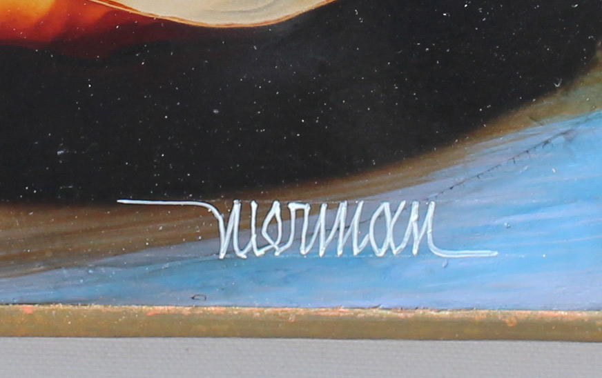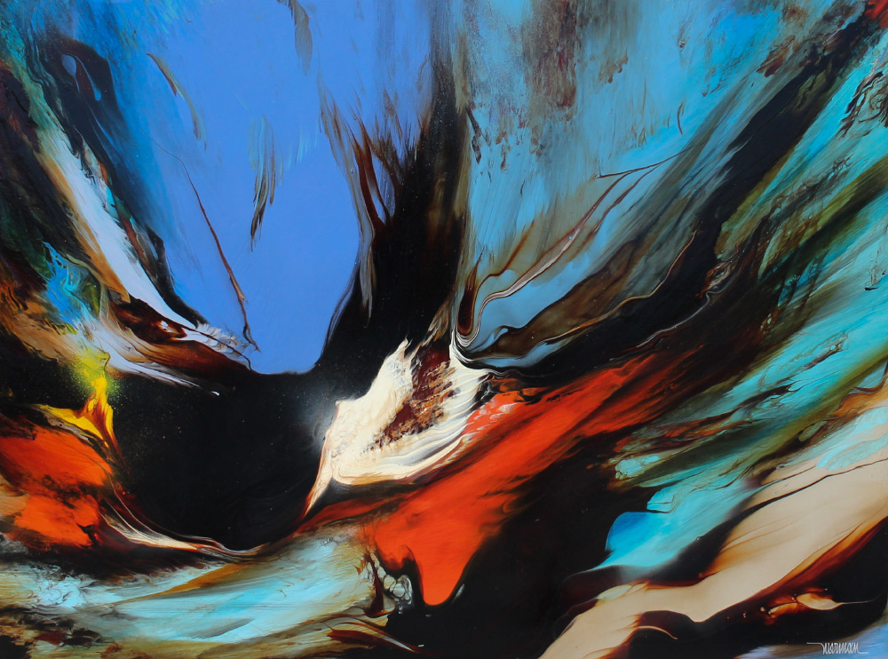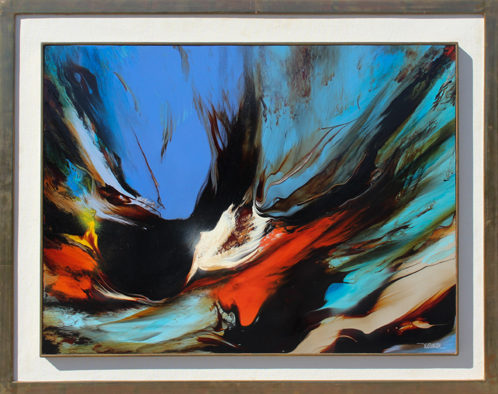 NIERMAN, Leonardo (Mexican, 1932-): Abstract Composition with Blues and Reds from Prophecy Series, Acrylic/ Masonite, 22'' x 30'', signed lower right, original frame, 31'' x 38.5''. Neirman is a leader in modern Mexican art and has had exhibitions in Mexico City, U.S., Italy, Israel, Australian, Spain and Japan. His abstract paintings are very colorful.