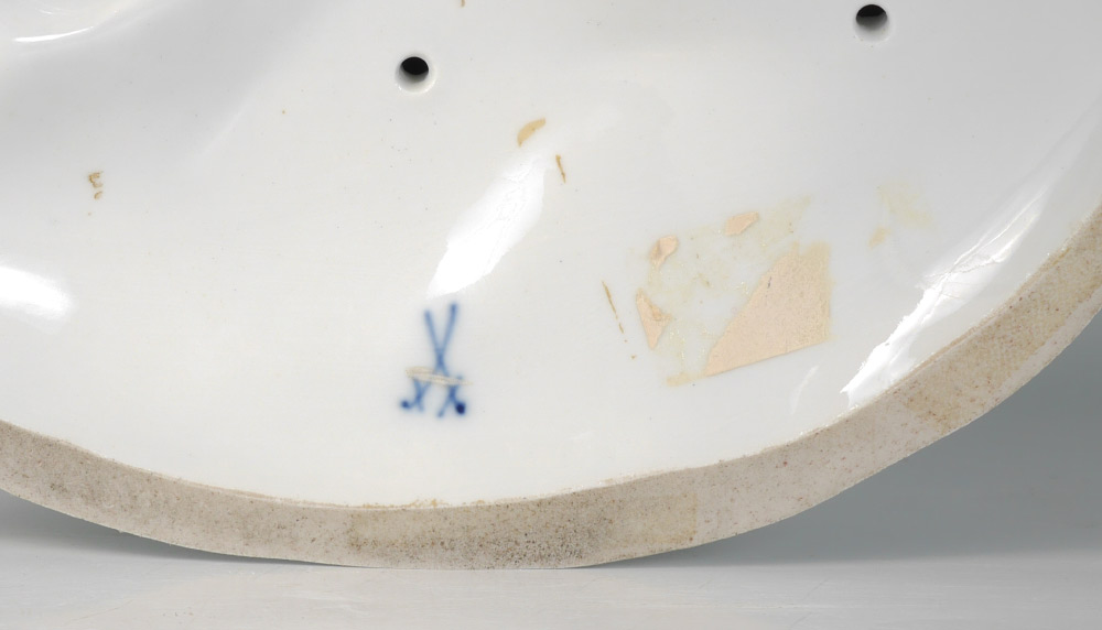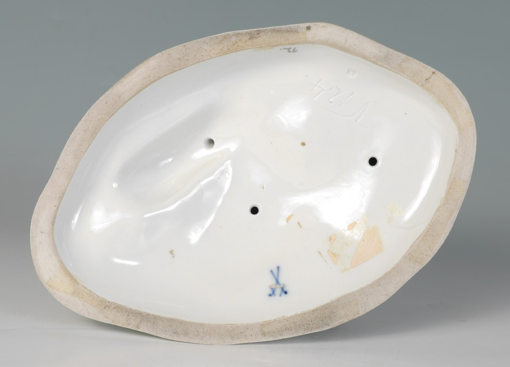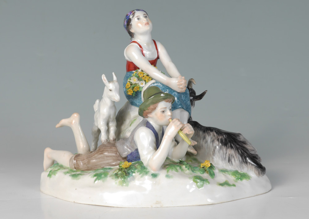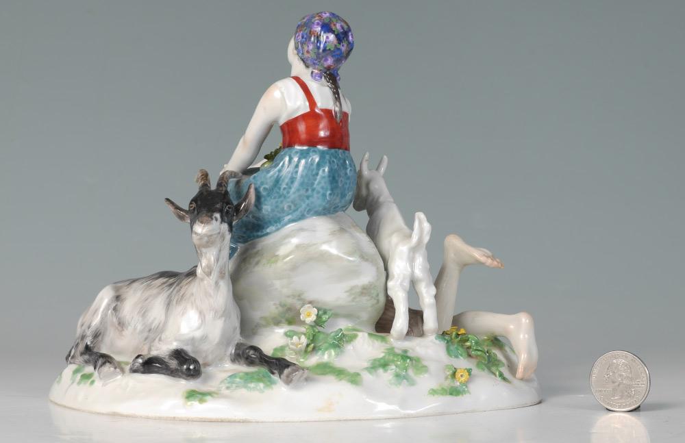20TH CENTURY MEISSEN FIGURAL GROUP WITH GOATS: Figure of a seated maiden with goats and boy playing a flute. Double crossed sword Meissen mark with incised line across (factory second), impressed 48, incised V 12.4. Measures 6 3/4'' h. x 8 1/4'' x 5 1/2''.