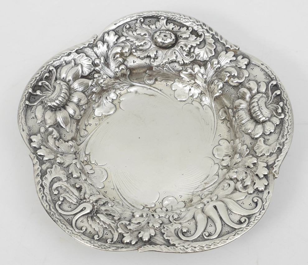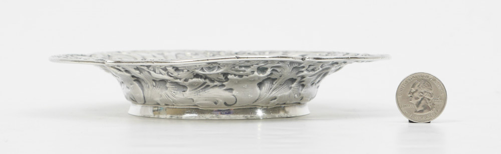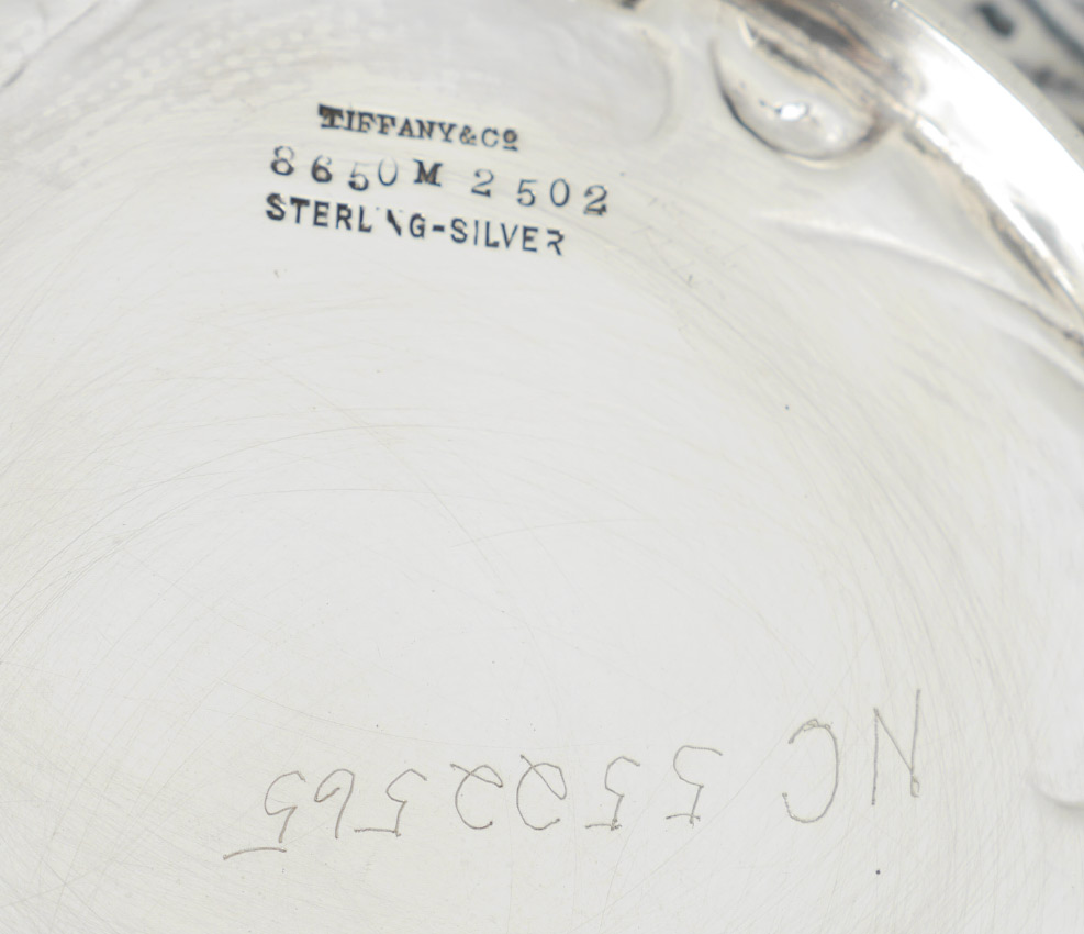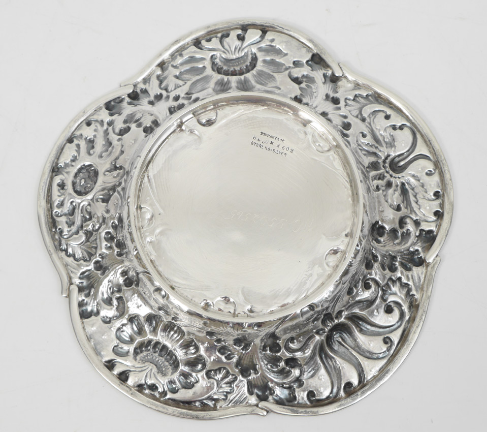 TIFFANY STERLING REPOUSSE DISH: Circa 1873-1891, floral motif scalloped rim, marked on base ''Tiffany & Co., 8650 M 2502, Sterling-Silver''. 1 1/4'' h. x 7'', approx. 7.2 troy oz.