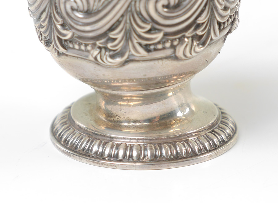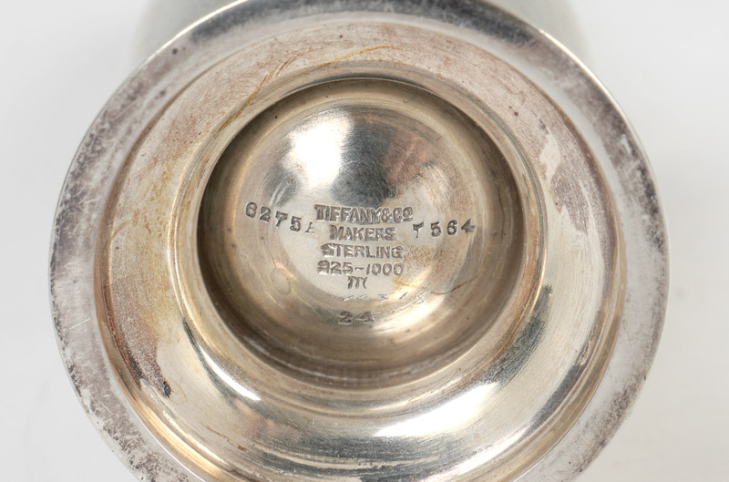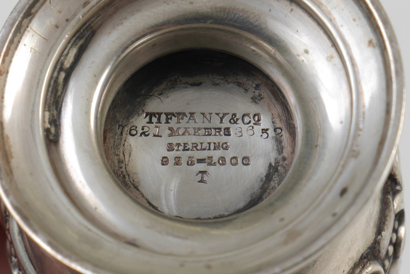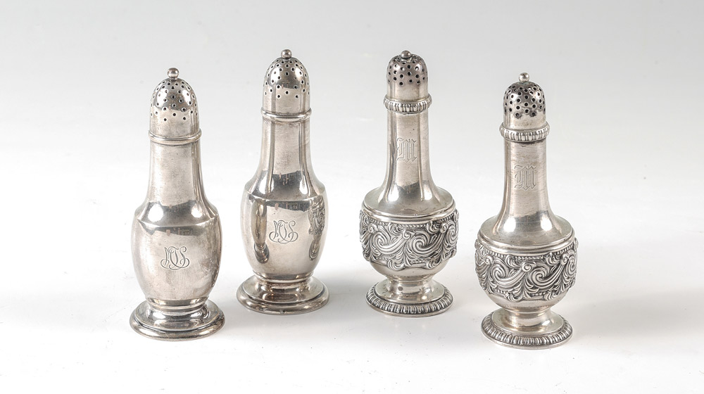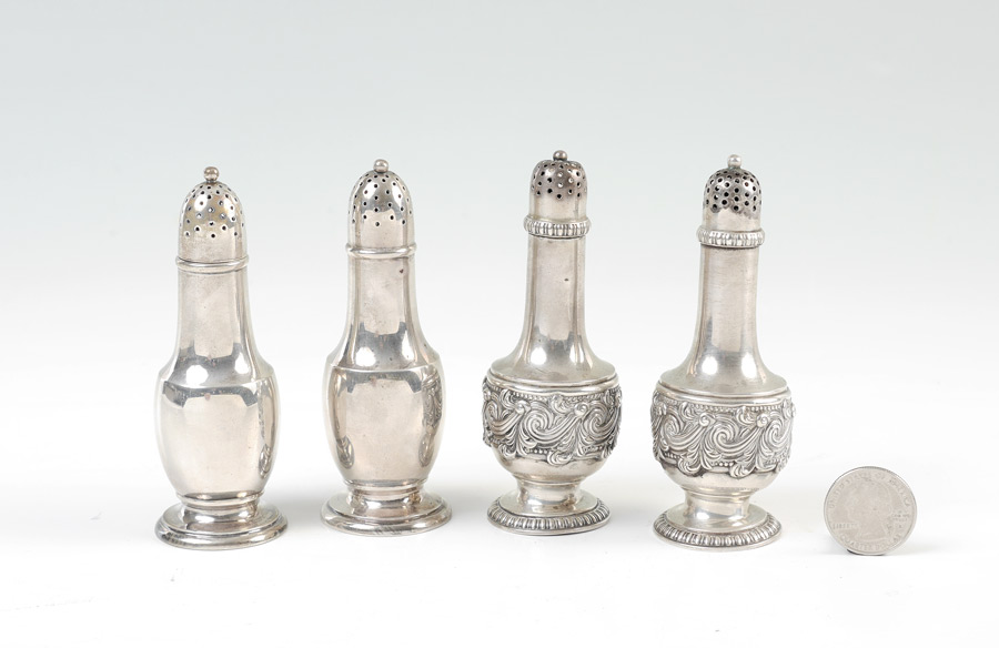 2 PAIR TIFFANY & CO STERLING SALT & PEPPER SHAKERS: 2 pairs, both marked Tiffany & Co., Sterling, to include 1) Embossed foliate design, numbers 7621 and 3652, 4'' h. 2) Classic design pair, numbers 6275A and 7564, 4'' h. Both monogrammed, approx. 9.4 troy oz.