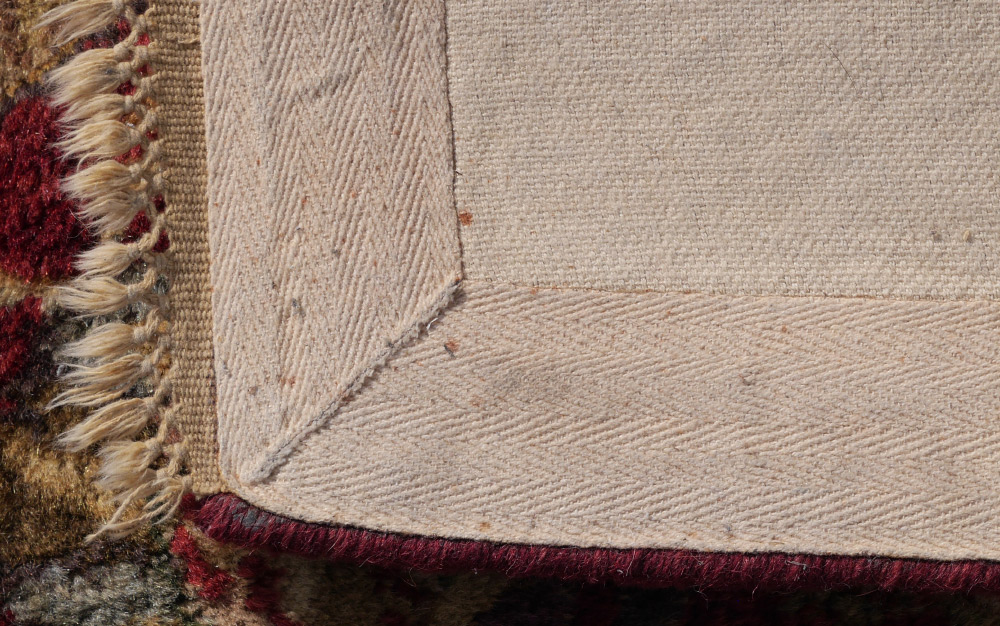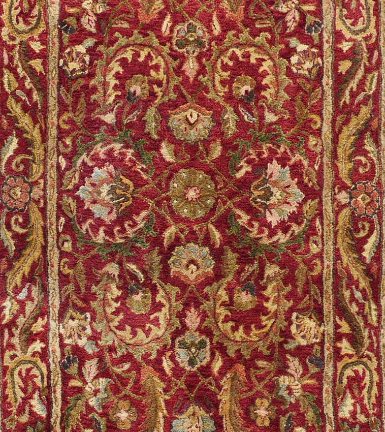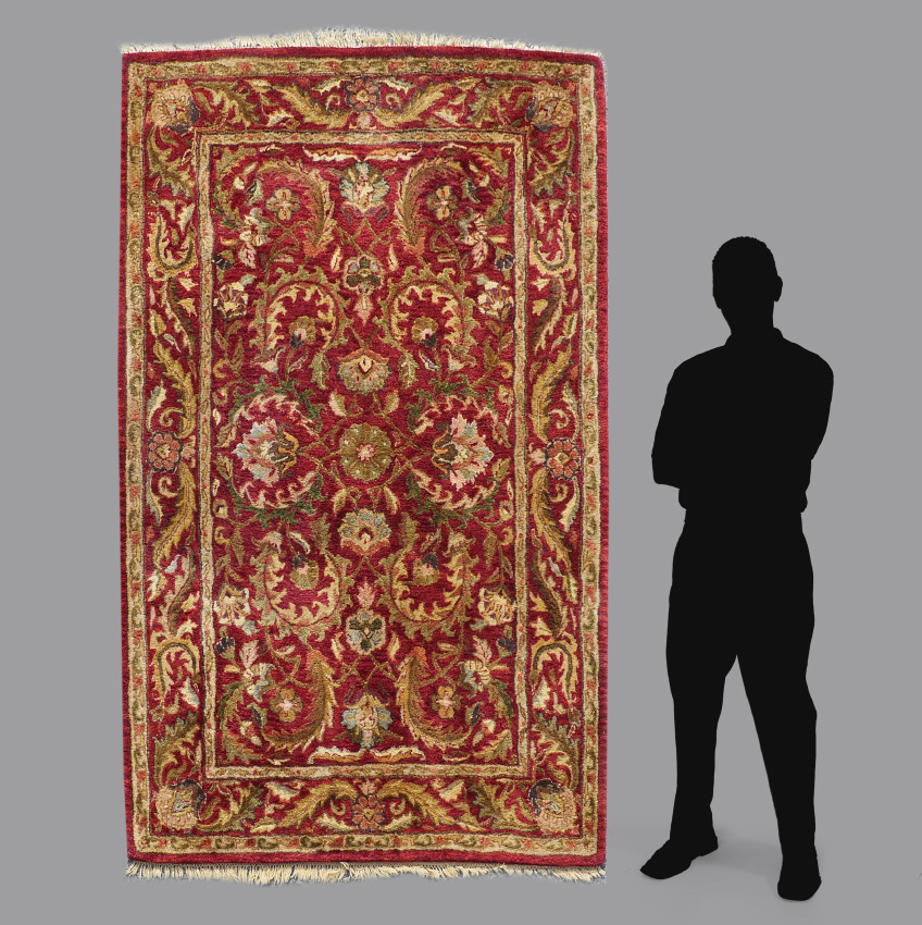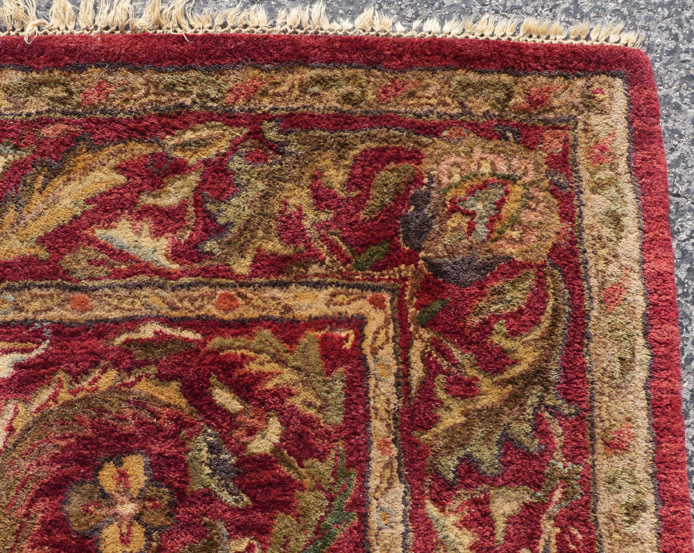 APPROX. 20-40 YR OLD INDO-PERSIAN HAND TUFTED WOOL RUG, 5' 3'' X 7' 11'': The red ground of this field has palmettes and flower heads down the center with palmettes radiating out from the center with long curved leaves around them. The main border has more of the long leaves with palmettes in the corners.