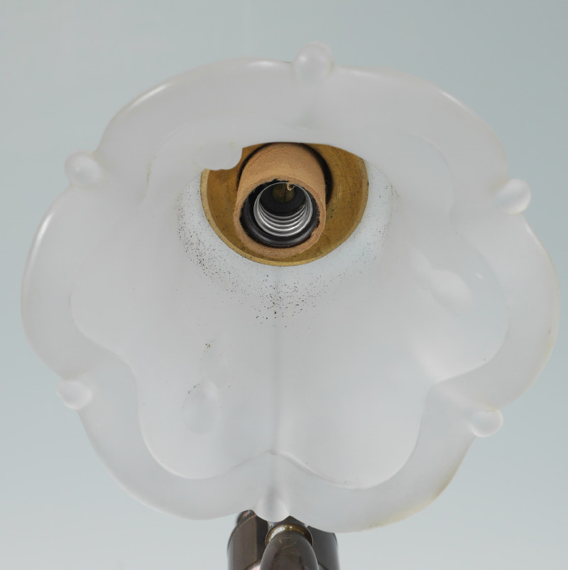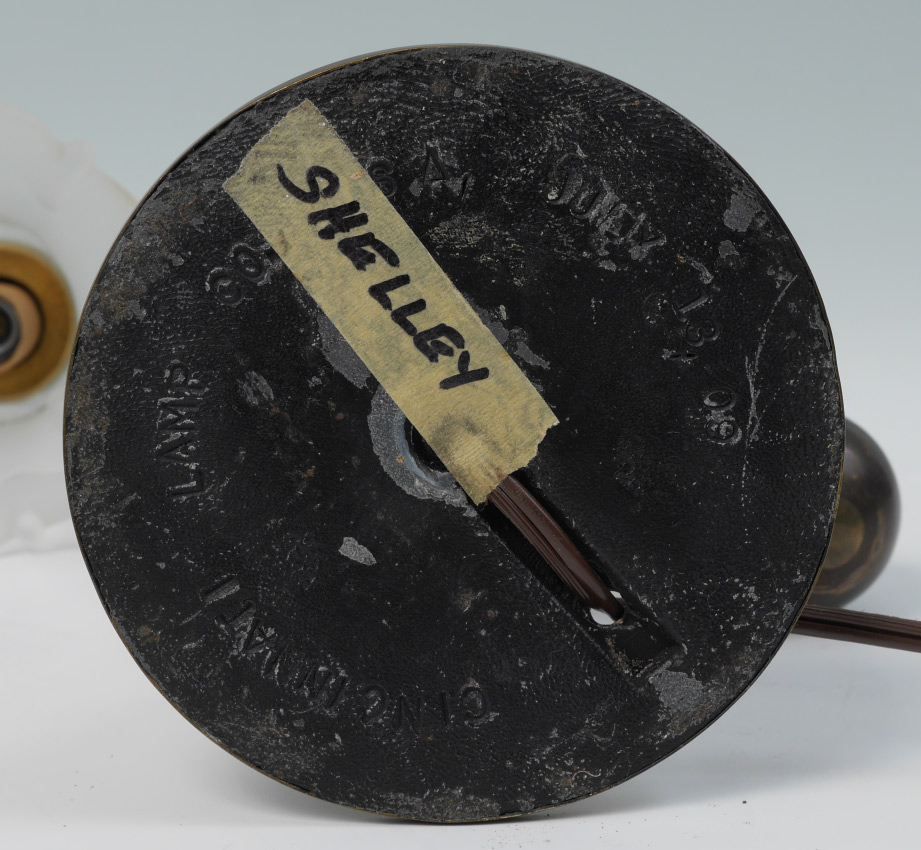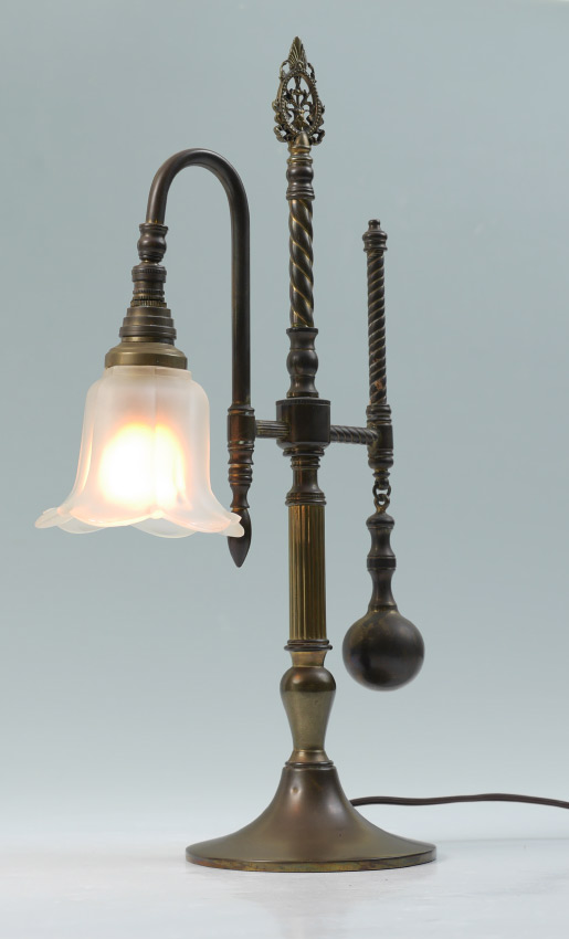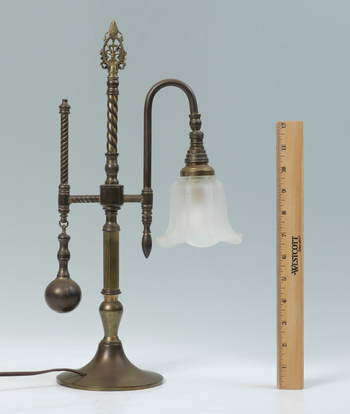 CINCINNATI LAMP COMPANY DESK LAMP: Weighted brass body and foot, single socket fixture, frosted glass shade with embossed teardrops interior, marked on base Cincinnati Lamp Co. Overall measures 17'' h. x 9''.