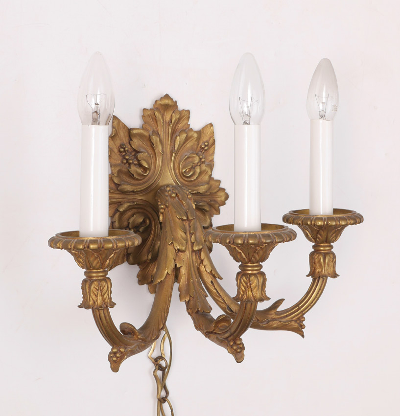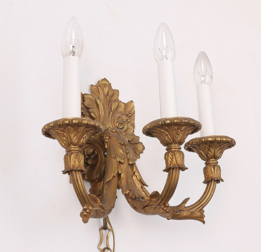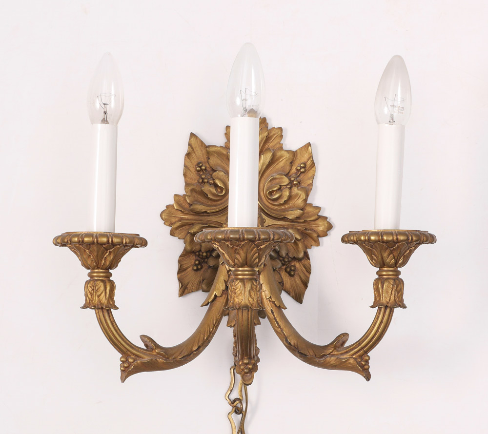 BRONZE FOLIATE MOTIF 3 LIGHT WALL SCONCE: Gold decorated cast bronze electric 3 arm sconce with a foliate motif. No visible marks, overall measures 14 1/4'' h. x 16 1/2'' x 11''.