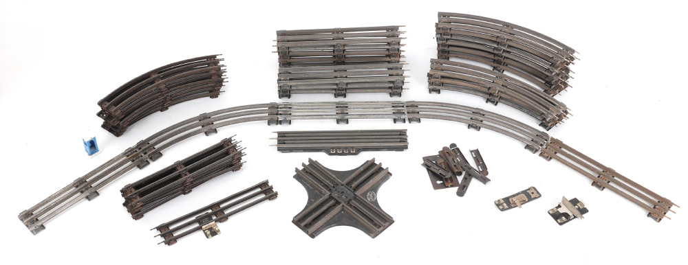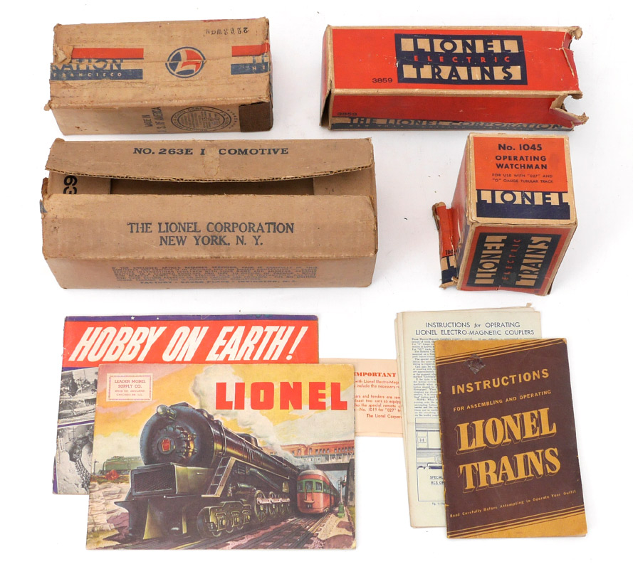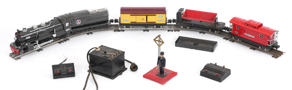 LIONEL 263E GUN METAL ENGINE & TENDER TRAIN SET: Part of a 5 car set with transformer, track, rare Switchman and more! To include Lionel 2-4-2 engine #263E, 2263W tender, 2814 automobile / furniture boxcar, 2817 caboose, 3859 dumping car. Lionel Multi Volt Type B transformer and accessories. Some sold with original boxes.