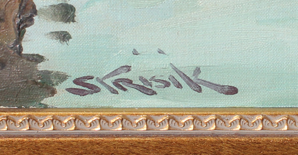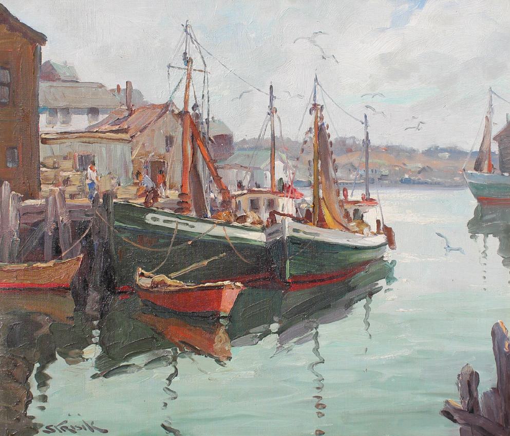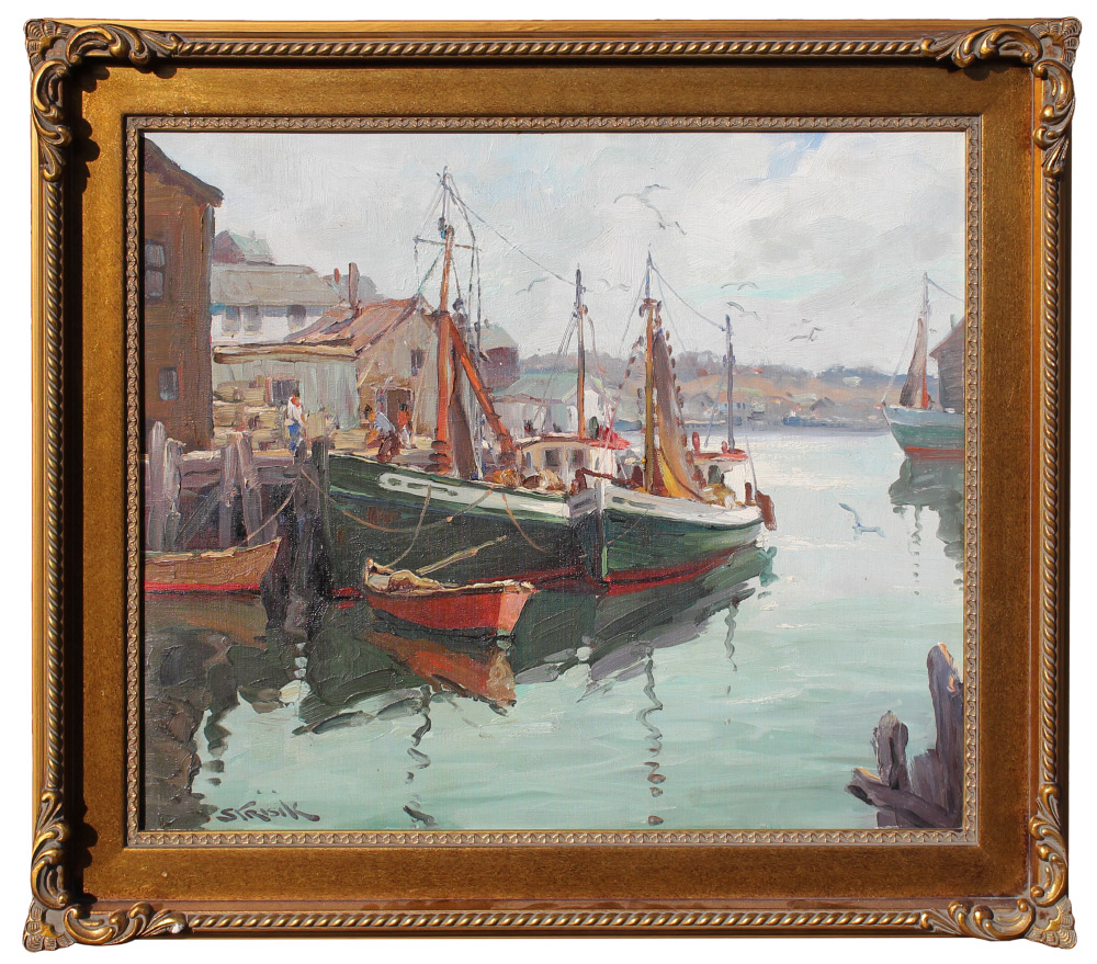STRISIK, Paul, (American, 1918-98): New England Harbor Dockside Scene, Oil/Canvas, 20'' x 24'', signed lower right, framed, 26'' x 30''. Strisik eventually lived in Rockport, Mass where he became known for his landscape painting. After serving in WWII in the Navy he studied at the Art Students League in New York City. Over the course of his career, he won 185 awards including 16 gold medals. He was very willing to share his talents with young artists and he wrote several books.