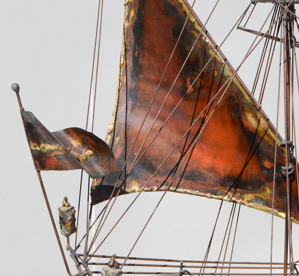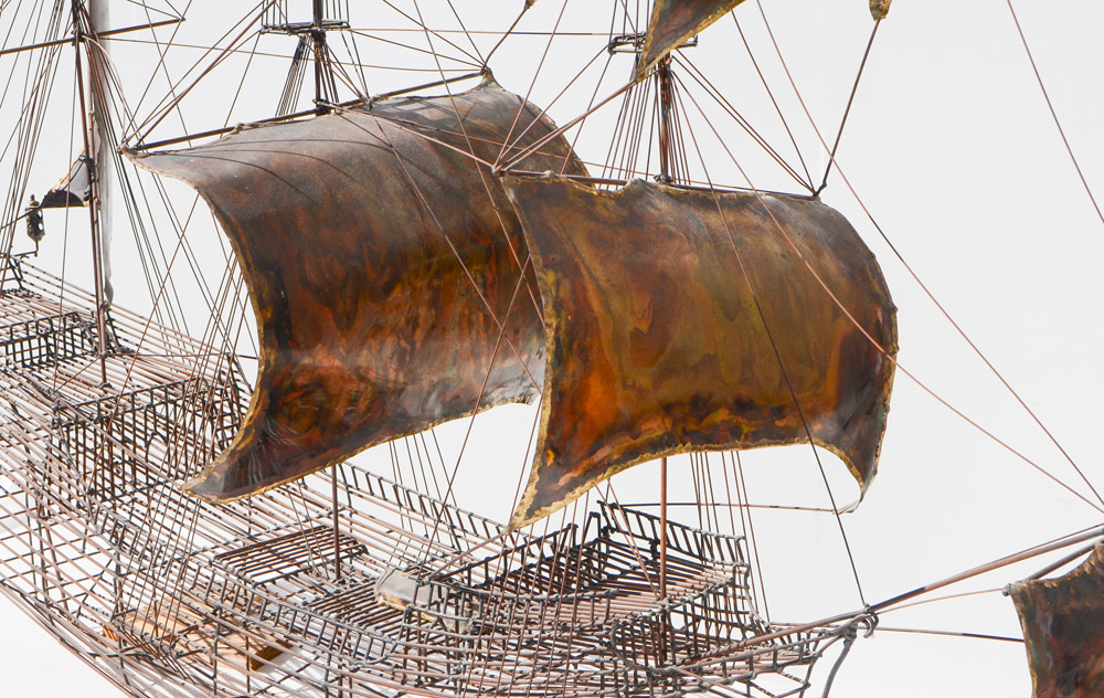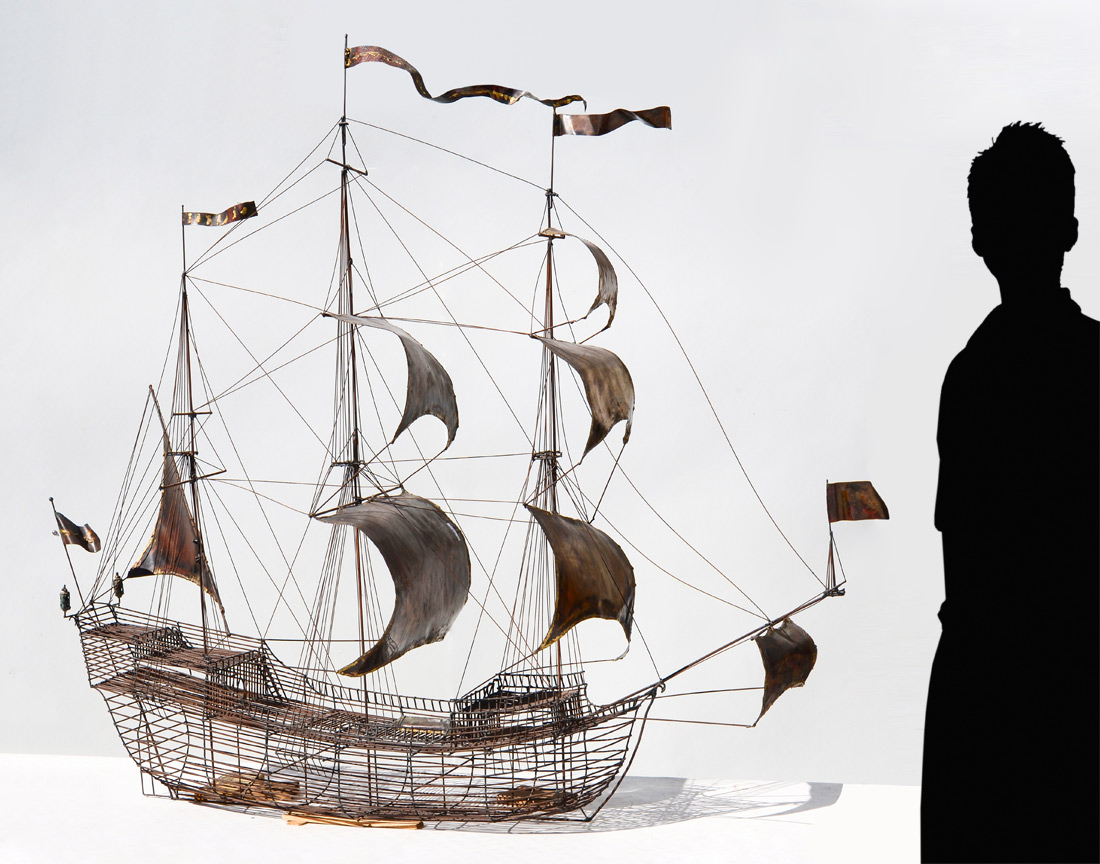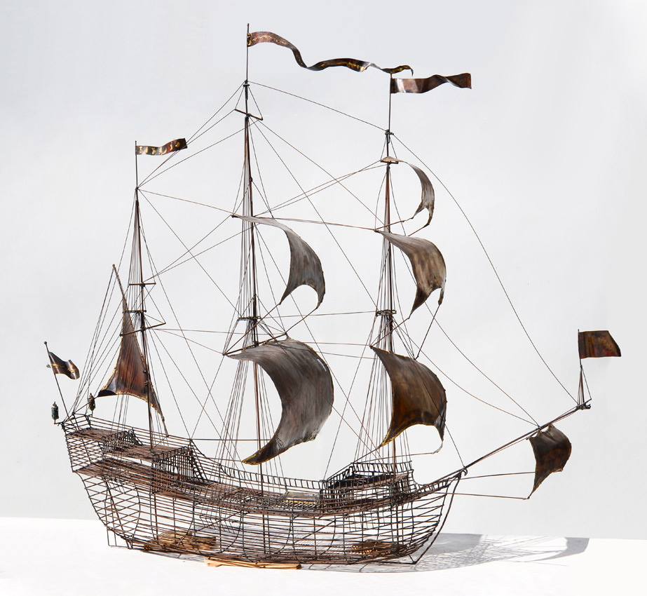 BROWN, Hobart, (American, 1934-2007): Steel rod ships model with copper sails, attribution, no visible signature, overall measures 60'' h. x 64'' x 19''. Comes with an email from a former welding apprentice identifying as most likely a Hobart piece.