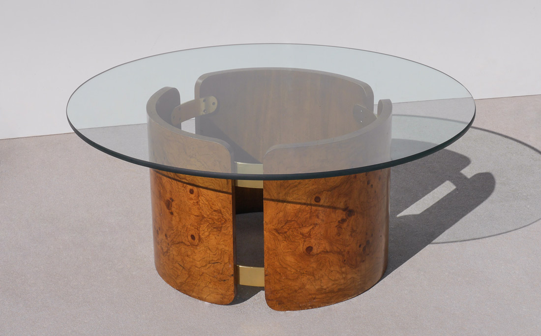 BURLWOOD ROUND COFFEE TABLE WITH GLASS TOP: 3 burlwood veneer section base with brass fittings, no visible maker's marks, 14 1/2'' h. x 21 1/2'' dia., glass top 36'' dia.