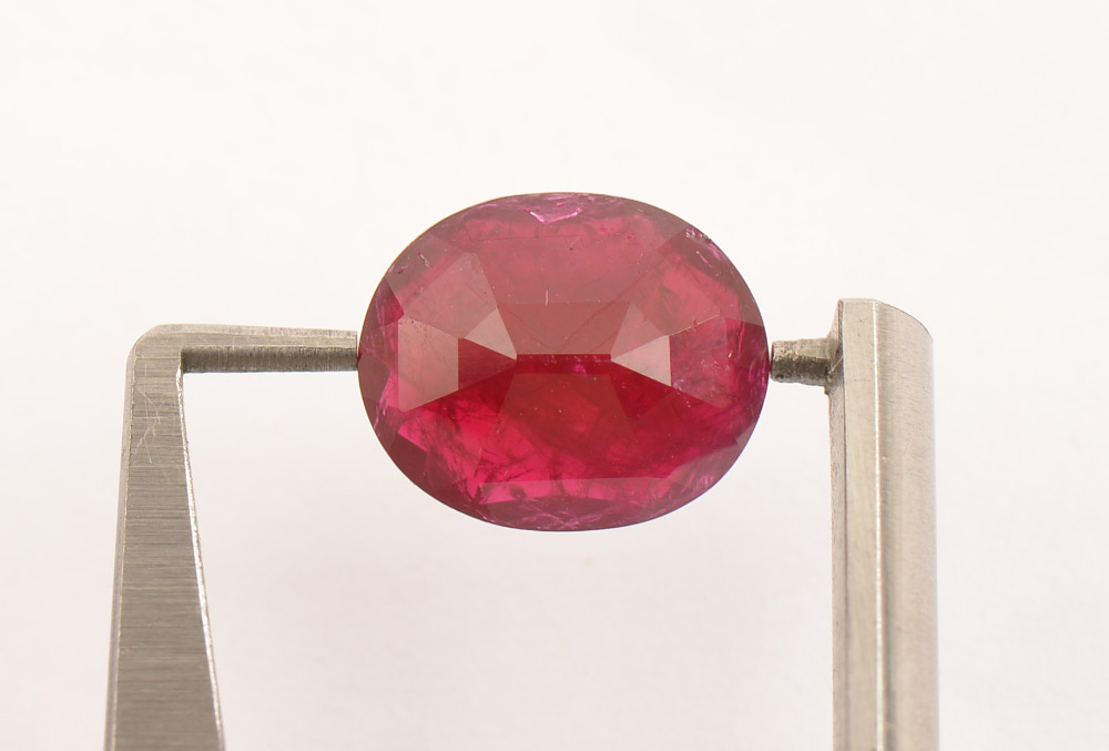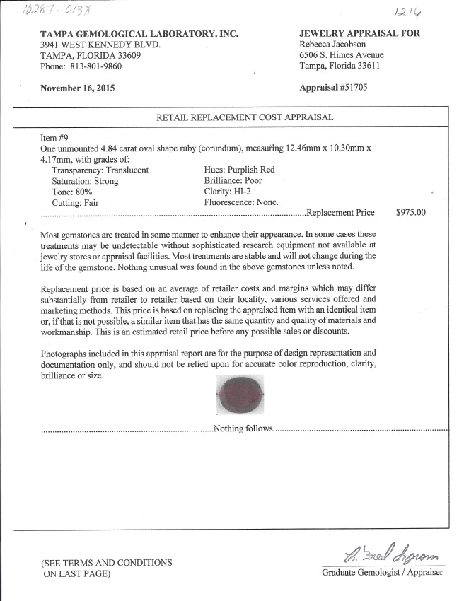 4.84 CARAT UNMOUNTED NATURAL RUBY: Purplish red ruby is 12.46mm x 10.30mm x 4.17mm and is ready to be mounted into your favorite piece of jewelry. Sold with current Tampa Gemological Laboratory appraisal for $975.