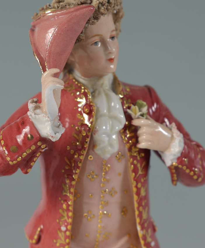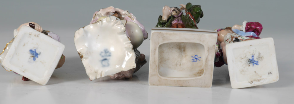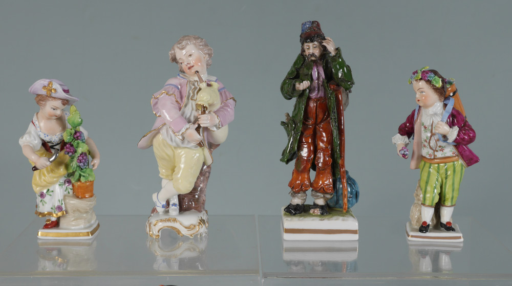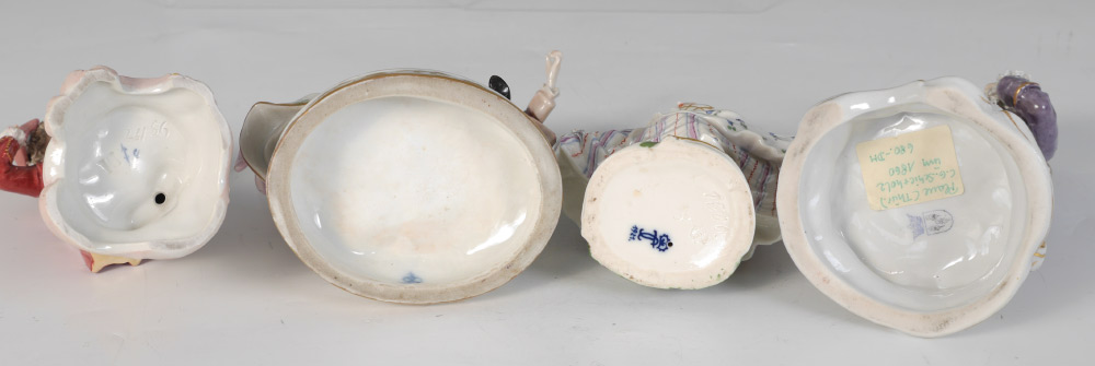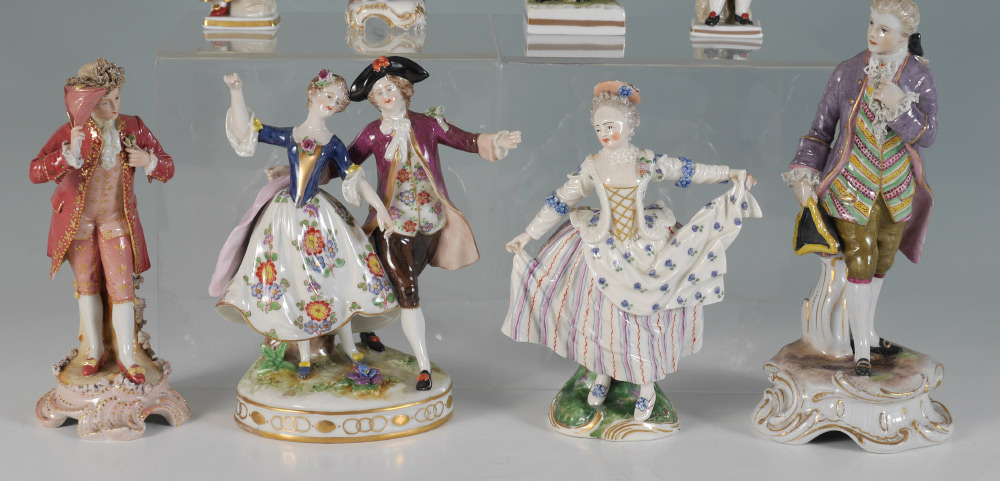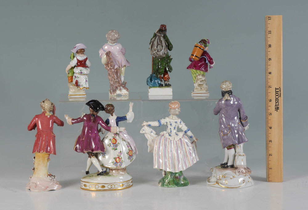 ESTATE COLLECTION OF 8 GERMAN PORCELAIN FIGURINES: An assembled collection of 8 figurines to include Sitzendorf, Nymphenberg, Scheibe-Alsbach, Shierholz and more. Largest figure of dancing couple measures 6 1/2'' h. x 5 1/4'' x 3 1/4''.