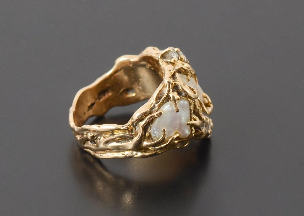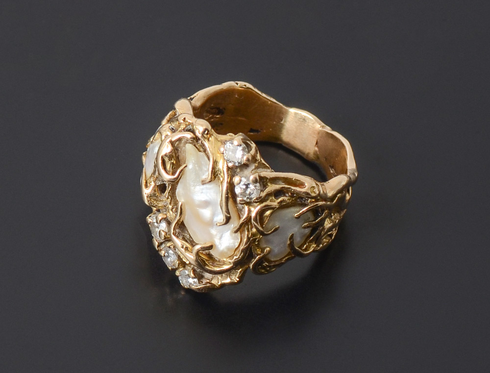 14K .38 CTW DIAMOND AND PEARL RING: 14K yellow gold ring contains 3 freeform cultured pearls. Five round brilliant cut diamonds. Weight: .38 Ct. Approx. Rated VS in clarity and H-I in color. The diamonds and pearls are prong set. Weight: 11.5 grams. Size: 7