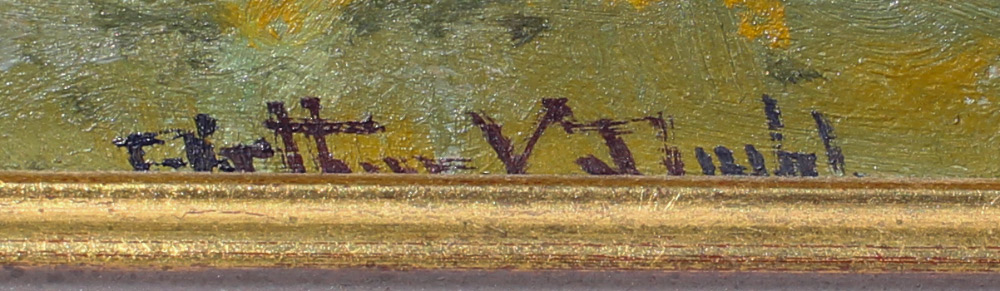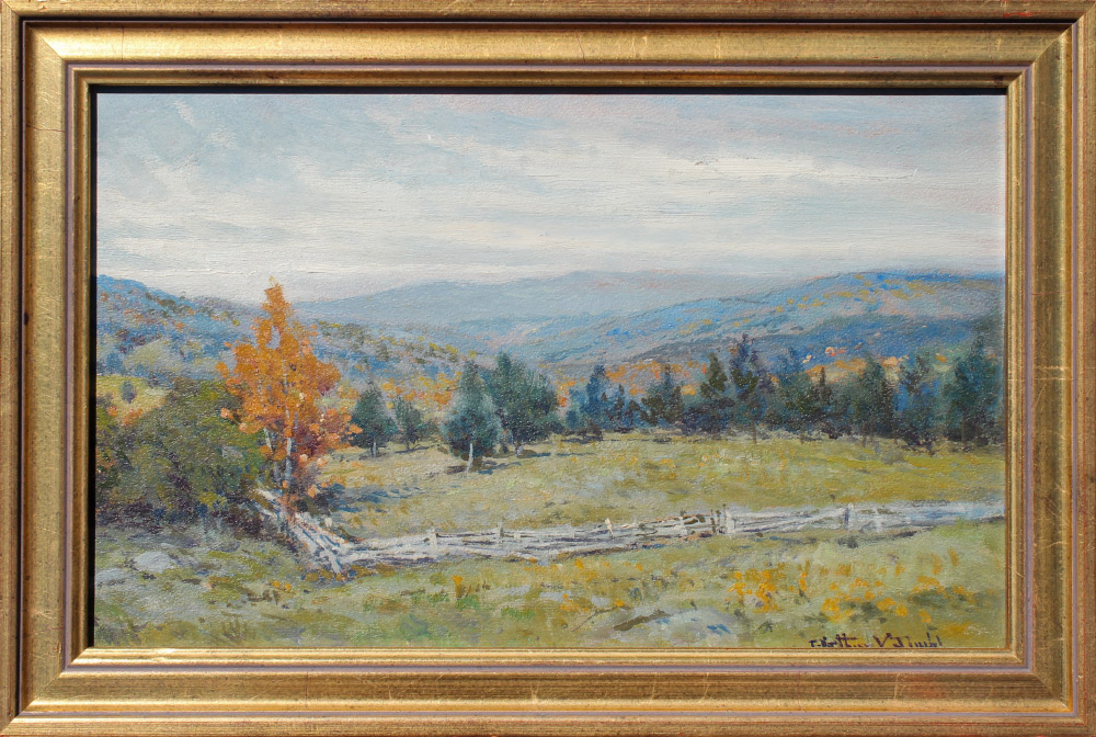 DIEHL, Arthur V., (English, 1870-1929): Panoramic Autumnal Pastoral Painting with Mountains in the Distance, Oil/Board, 10'' x 16'', signed lower right, framed, 12.25'' x 18.25''. Diehl was born in England to an artistic family and came to America in 1891. While maintaining 2 to 3 studios he also painted for tourists in Cape Cod, Massachusetts and St Augustine, FL, often selling his just competed work to them.