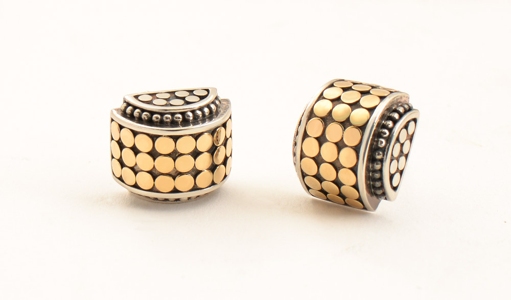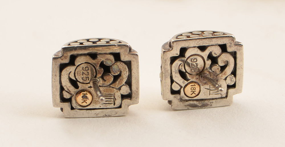 SS JOHN HARDY EAR STUDS WITH 18K GOLD DOTS: Signed and marked their total weight is 9.6 grams.
