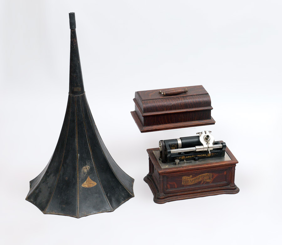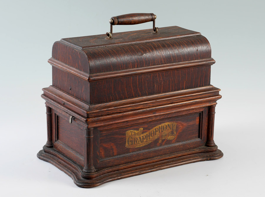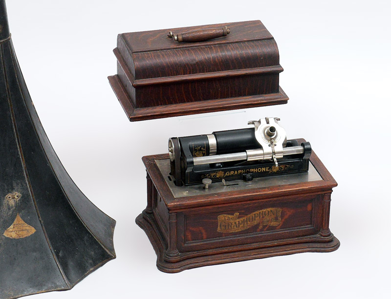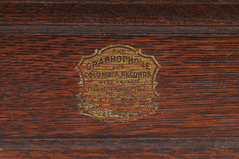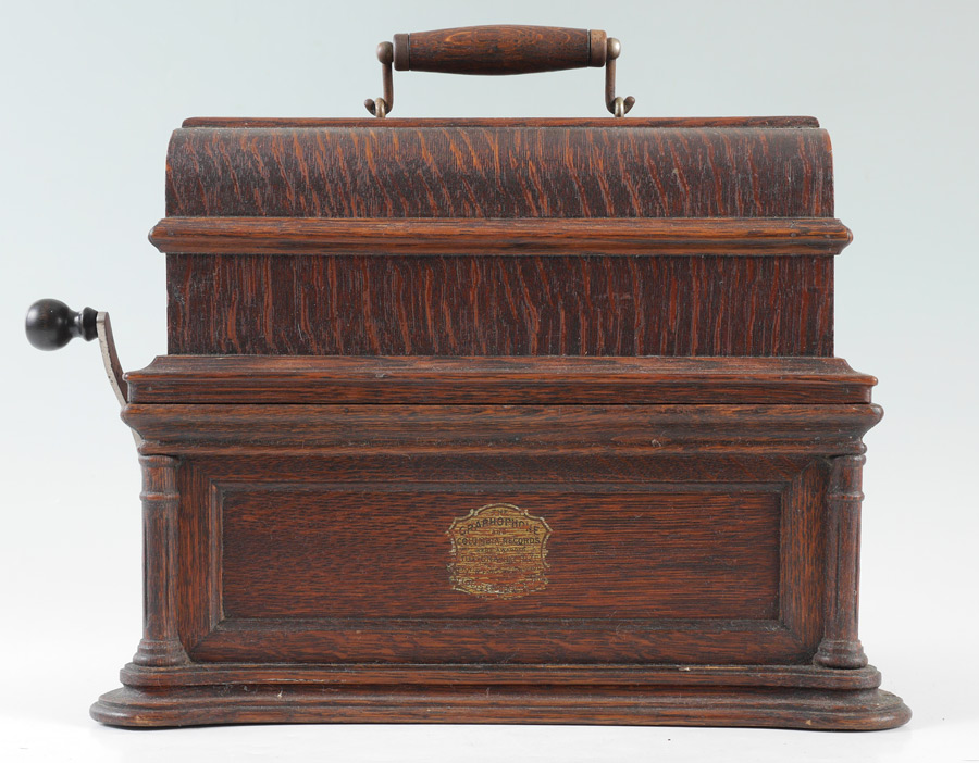 OAK COLUMBIA GRAPHOPHONE CYLINDER PLAYER WITH HORN: Oak case with original labels, shaped base with columns at corners, black painted chassis with decoration, overall measures 12 1/2'' h. x 15 3/4'' x 9 1/2''. Sold with a black painted Edison metal ''morning glory'' horn with original label, 31 1/2'' h. x 19'' dia.