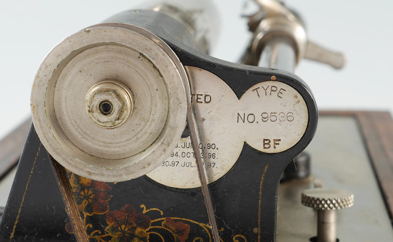 CONDITION: Loss of paint to horn, expected wear to case of Graphophone, currently cranks and spins fine.