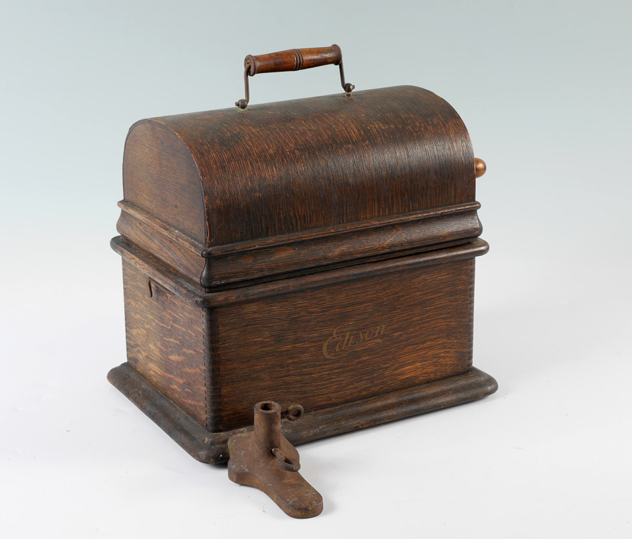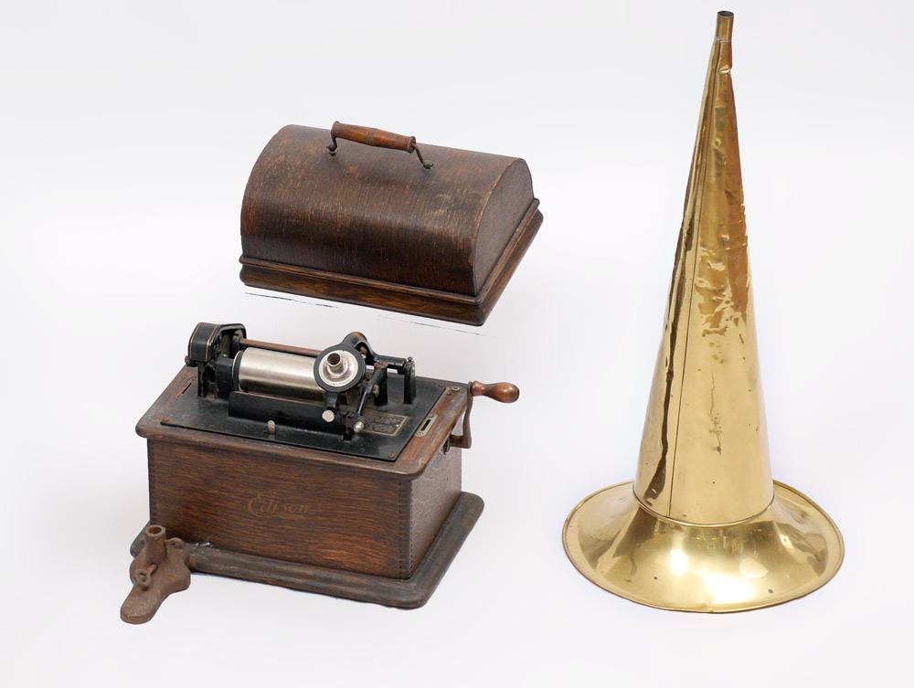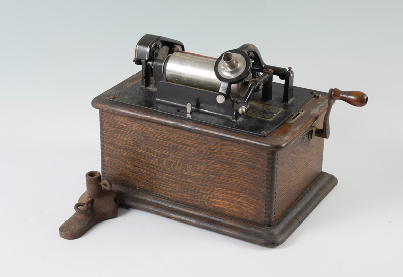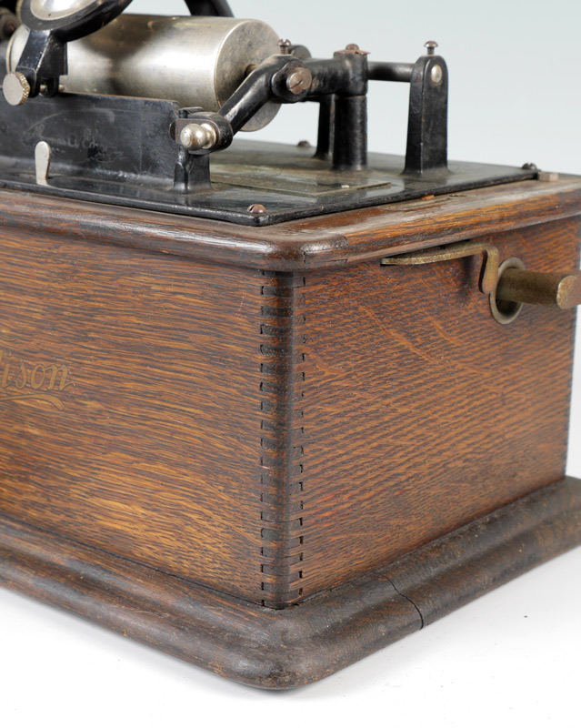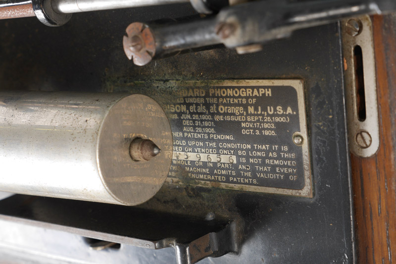 EDISON STANDARD CYLINDER PHONOGRAPH WITH BRASS HORN: Oak case with original Edison label, black painted chassis, plaque with serial number 459656, front mounted stand for horn. Measures 13 3/4'' h. x 15'' x 14''. Sold with a brass horn, 24 1/4'' h. x 11 1/2''.