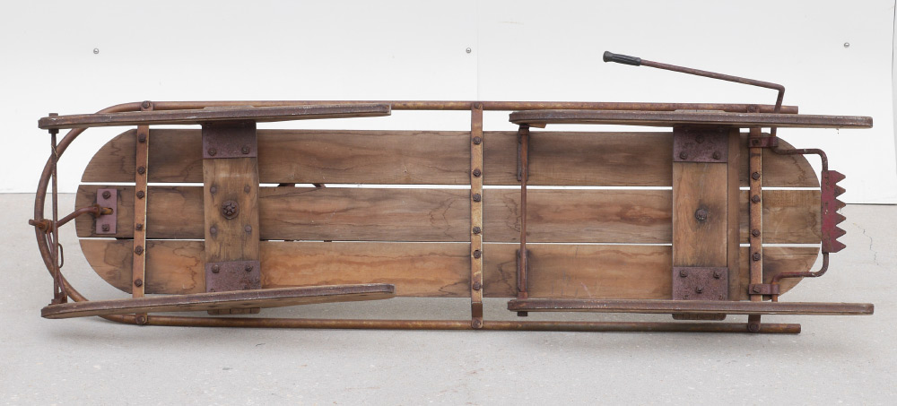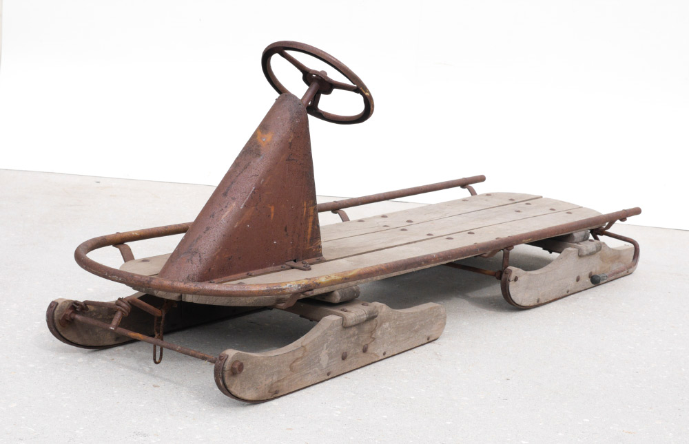 ANTIQUE SLED WITH STEERING WHEEL: Wood base and runners, metal steering wheel, shaft cover, safety bar and back brake handle. Overall 22 1/2'' h. x 62'' x 17''. Provenance: Ben Garcia (Otok Ben-Hvar), Estate