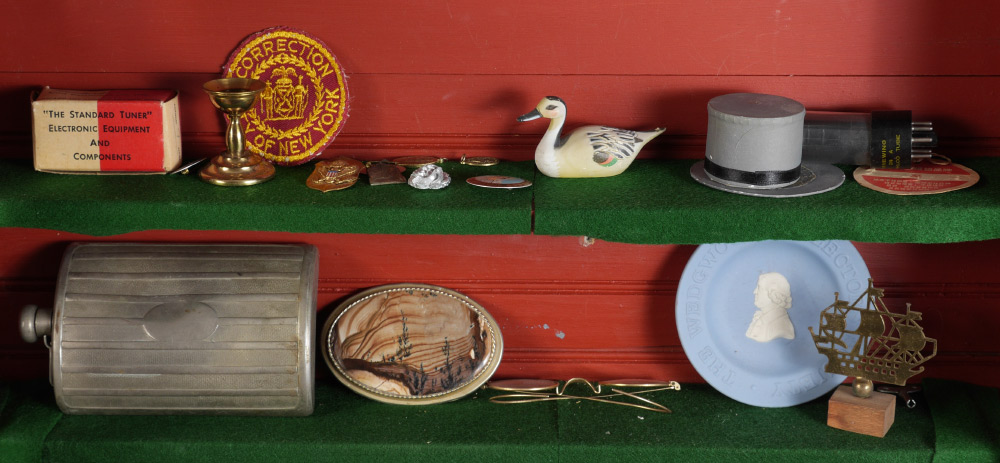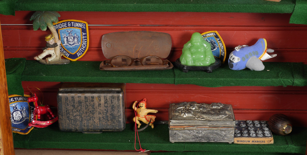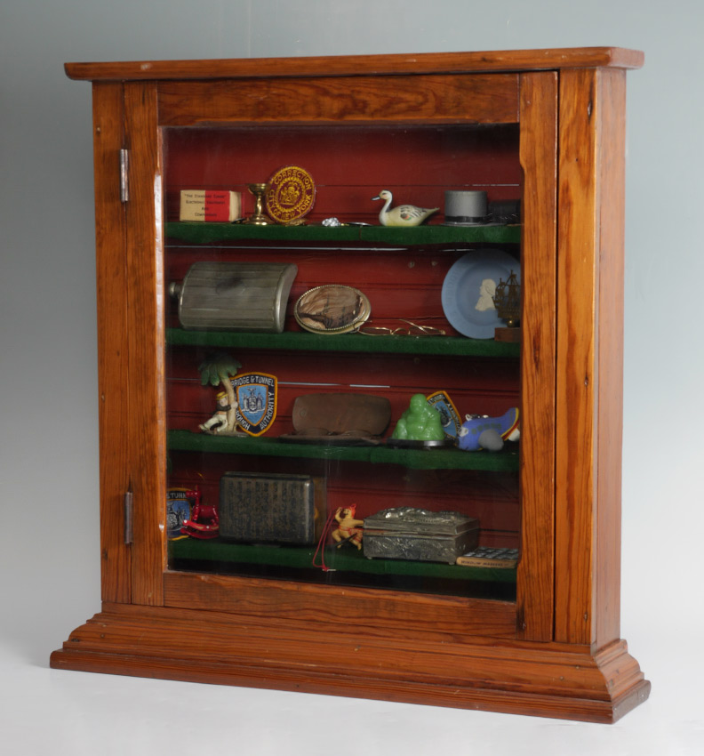 OAK COUNTER TOP DISPLAY CASE WITH SOUVENIRS: Nice golden oak display case with single glass door, filled with tchotchkes and souvenirs acquired by Ben Garcia (Otok Ben-Hvar) throughout his life time, measures 30'' h. x 29 1/4'' x 6 3/4''.