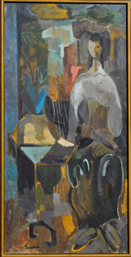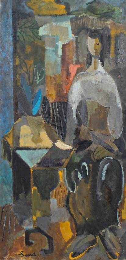 LARGE 20th CENTURY MODERNIST PAINTING WOMEN AND PATTERNS: Women and Patterns, Oil/Canvas, 56'' x 28'', signed lower left, signed on stretcher verso, original wood frame, 57'' x 29''.