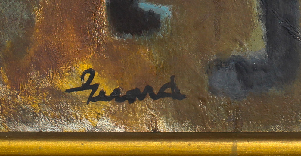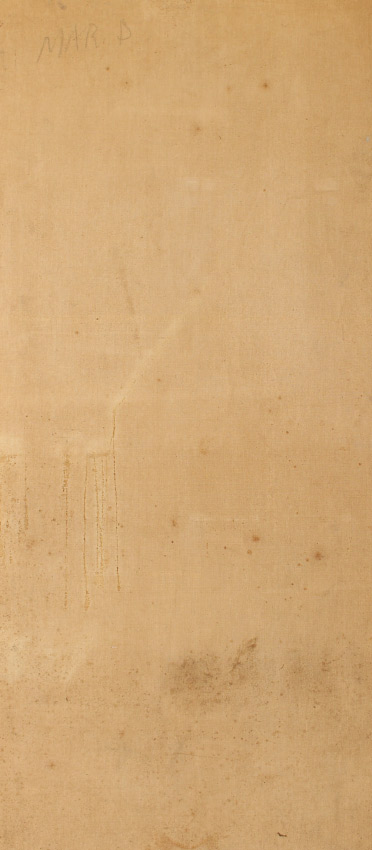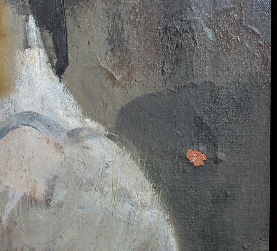 CONDITION: Area in left margin shows some craquelure and some minor uplifting with fleck of paint loss. Fleck of paint loss in right margin and area of uplifting and craquelure; paint is unstable in upper mid-center. Needs cleaning, sold as is.