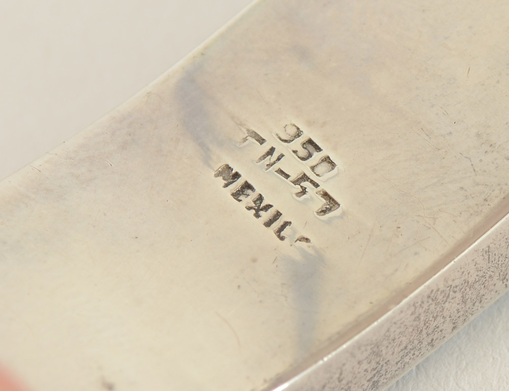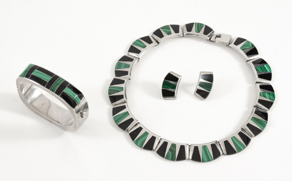 3 PIECE SUITE - GREEN AND BLACK ONYX IN MEXICAN SILVER: All pieces are stamped 950 Mexico. Necklace and bracelet have makers mark. 1) Bracelet is inlaid with green and black onyx in a contemporary pattern across one side of this .725'' wide bracelet. Measures 6.5'' inside; 2) Slightly curved earrings are approx. 1'' in length and .625'' wide, inlaid with black and green onyx. Post and nut closure; 3) 14 curved links are connected to form this 17'' necklace. Each link is inlaid with a single green onyx flanked by 2 black onyx. Total weight 7.854 Troy ounces.