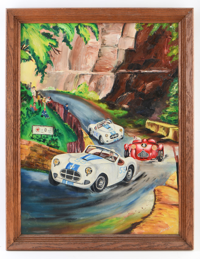 ADAMSON, Neil, (American, 20th Century): ''Watkins Glen'' 2 Cunningham C2R's, Allard J2, 1951, Oil on Canvasboard, 24'' x 18'', signed lower right, signed and titled verso, framed, 27'' x 21'', acquired from personal friend of the artist.