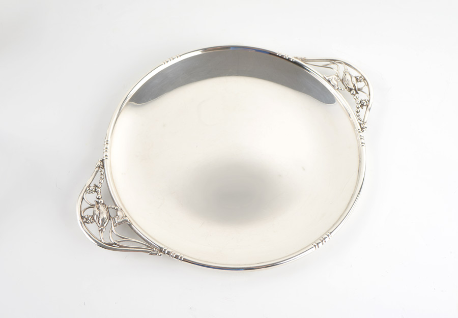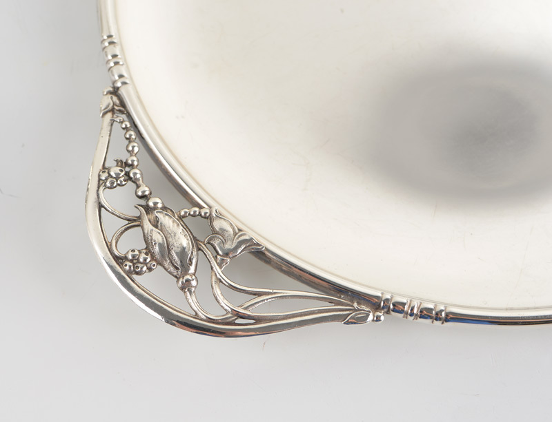 GEORG JENSEN STYLE BLOSSOM STERLING TRAY: Sterling tray in the manner of the Georg Jensen Blossom pattern, unknown maker stamp on base, 13 1/2'' dia. Approx. 16.4 troy oz.