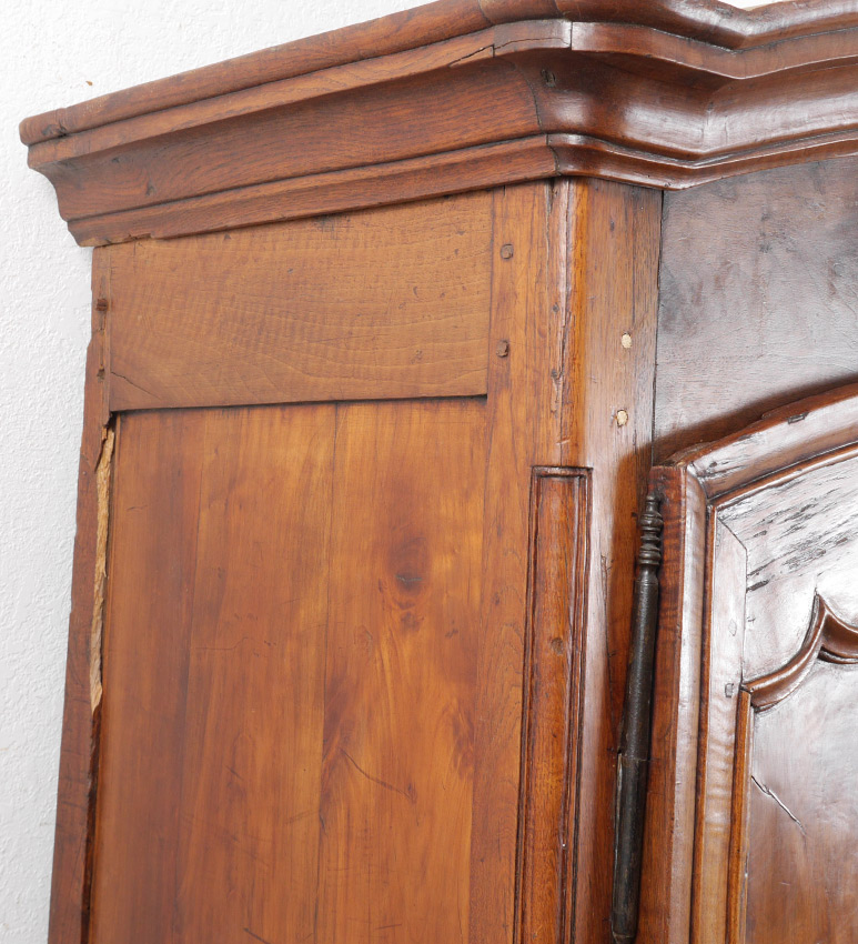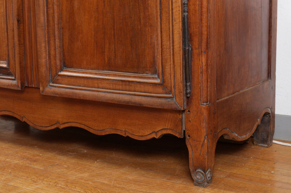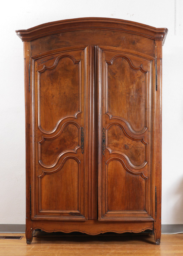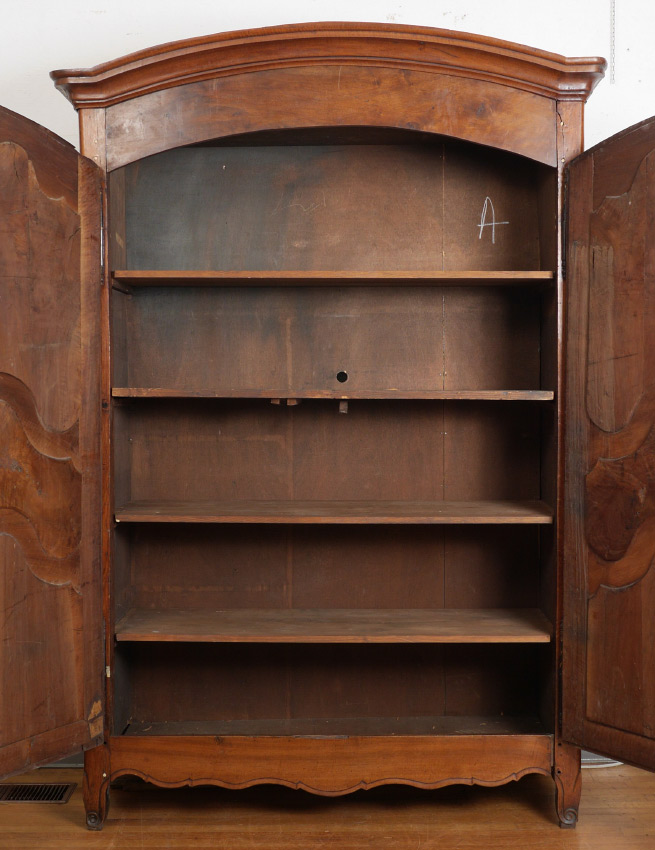 FRENCH WALNUT COUNTRY ARMOIRE: Shaped top, 2 doors with shaped panels, shaped skirt, 4 internal shelves, overall measures 88 1/2'' x 61'' x 25''. INTERNET BIDDING IS NOT AVAILABLE ON THIS LOT.