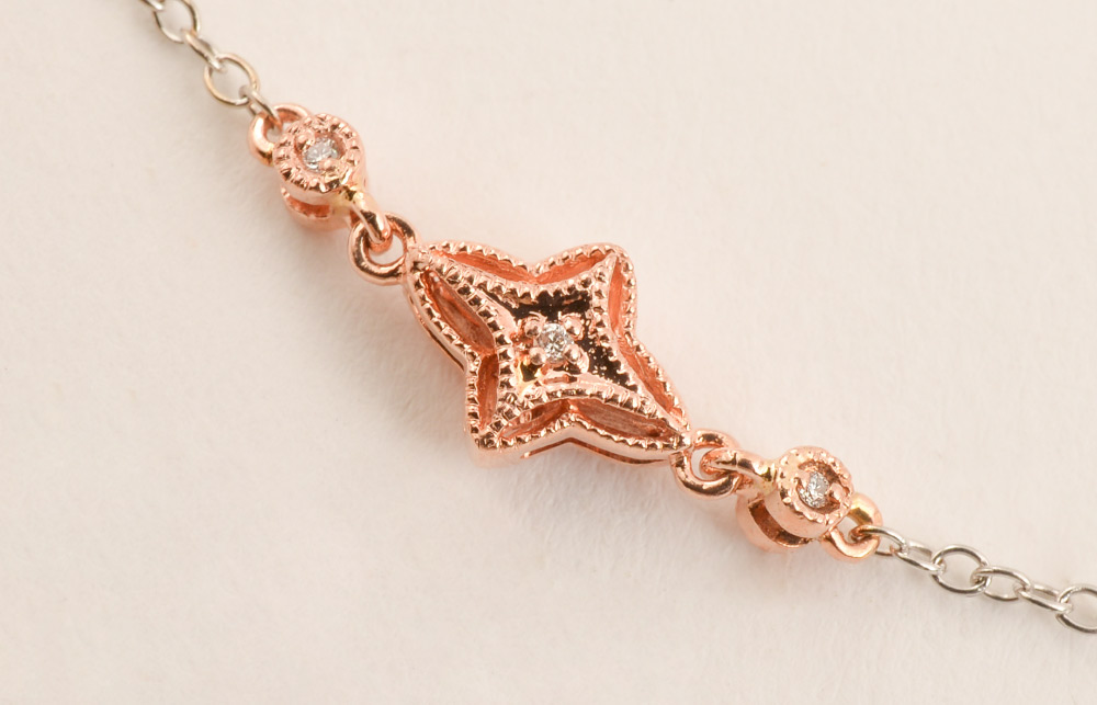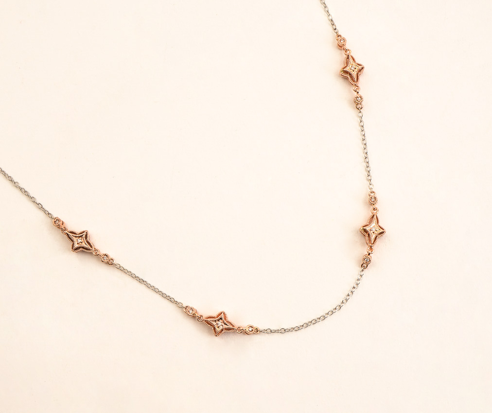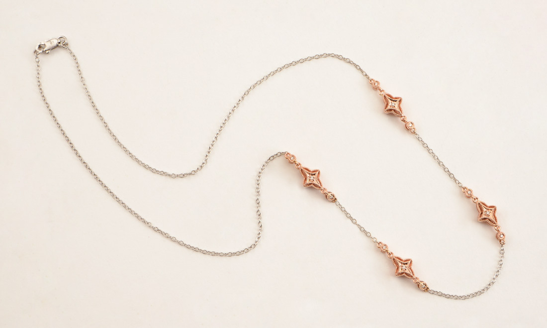 14K WHITE & ROSE GOLD CHAIN WITH DIAMONDS: 16'' chain has 4 rose gold stations and each station is set with 3 brilliant cut diamonds. Total weight 5.75 grams.