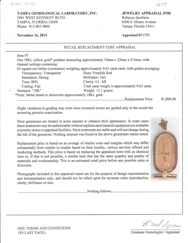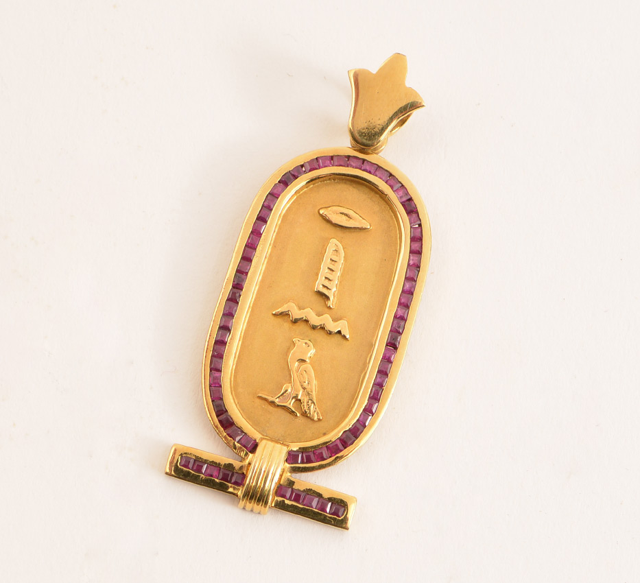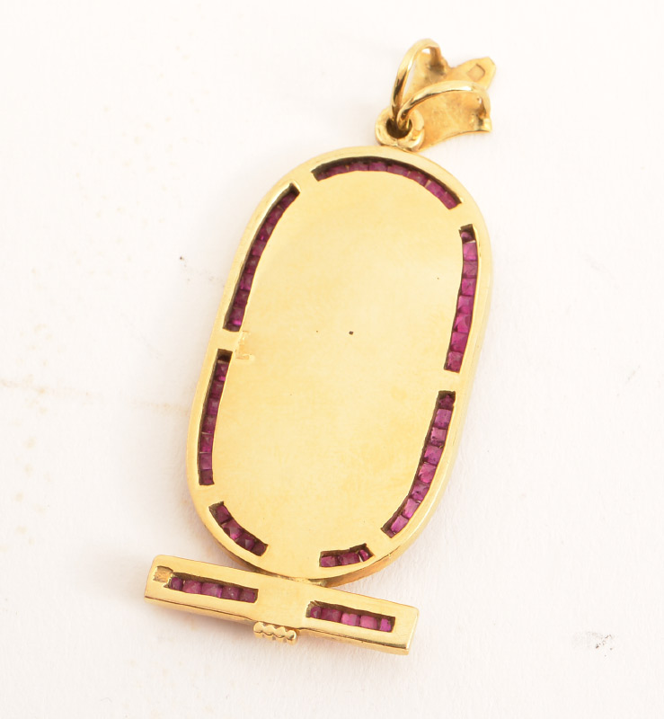 18K GOLD AND RUBY EGYPTIAN PENDANT: 18K yellow gold Egyptian motif pendant surrounded by 63 square cut rubies with a total carat weight .63CT. Pendant dimensions .925'' x 1.75''. Total weight 12.1 grams. Sold with current Tampa Gemological Laboratory appraisal for $1800.