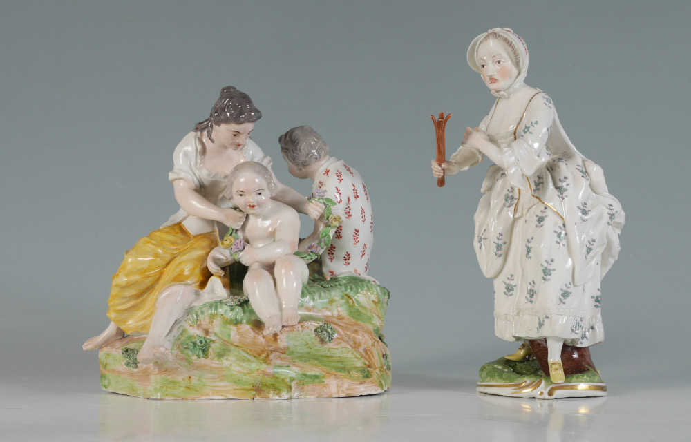 2 FRANKENTHAL PORCELAIN FIGURES: 2 pieces total to include 1) Figural group of woman, man and putti with floral garland and baskets, blue mark on base, measures 5 3/4'' h. x 6 1/2'' x 6 1/2''. 2) Figure of a stern woman with a stick, obscured blue mark on base, 7'' h.