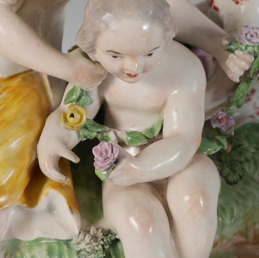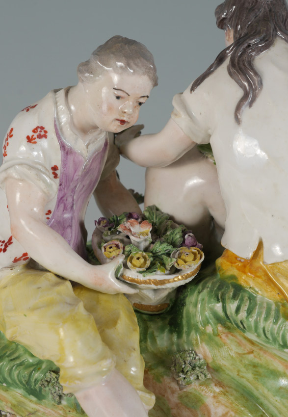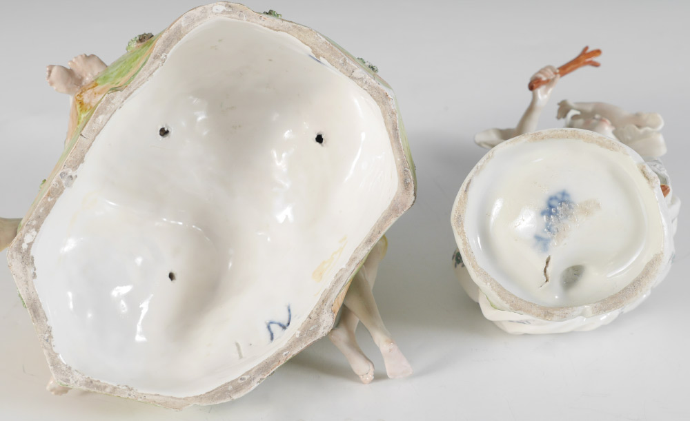 CONDITION: 1) Minor chips to base, leaves and flower petals. Professional repair to man's feet. 2) No conditions issues noted.