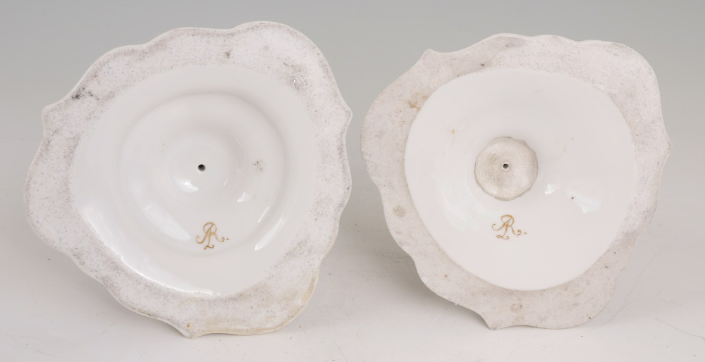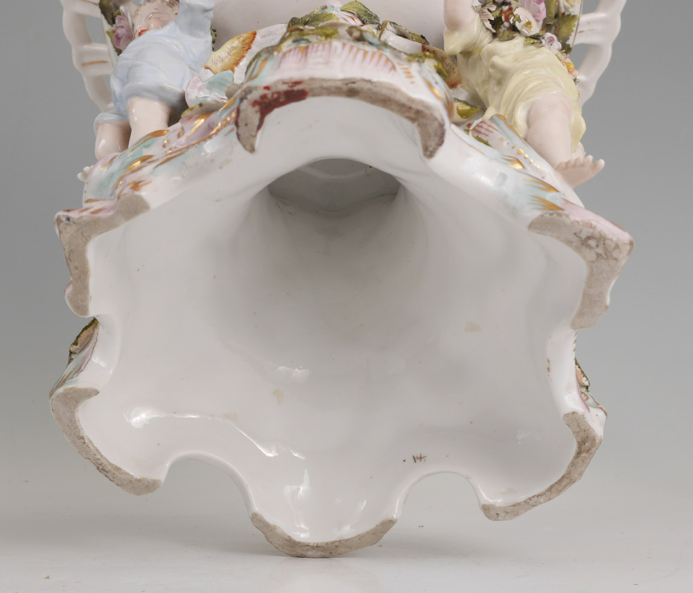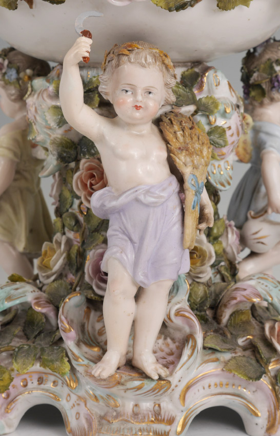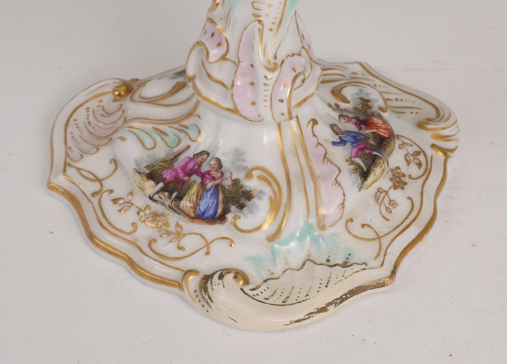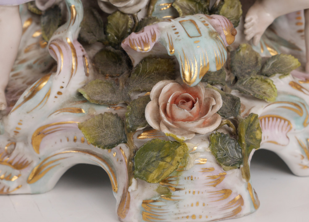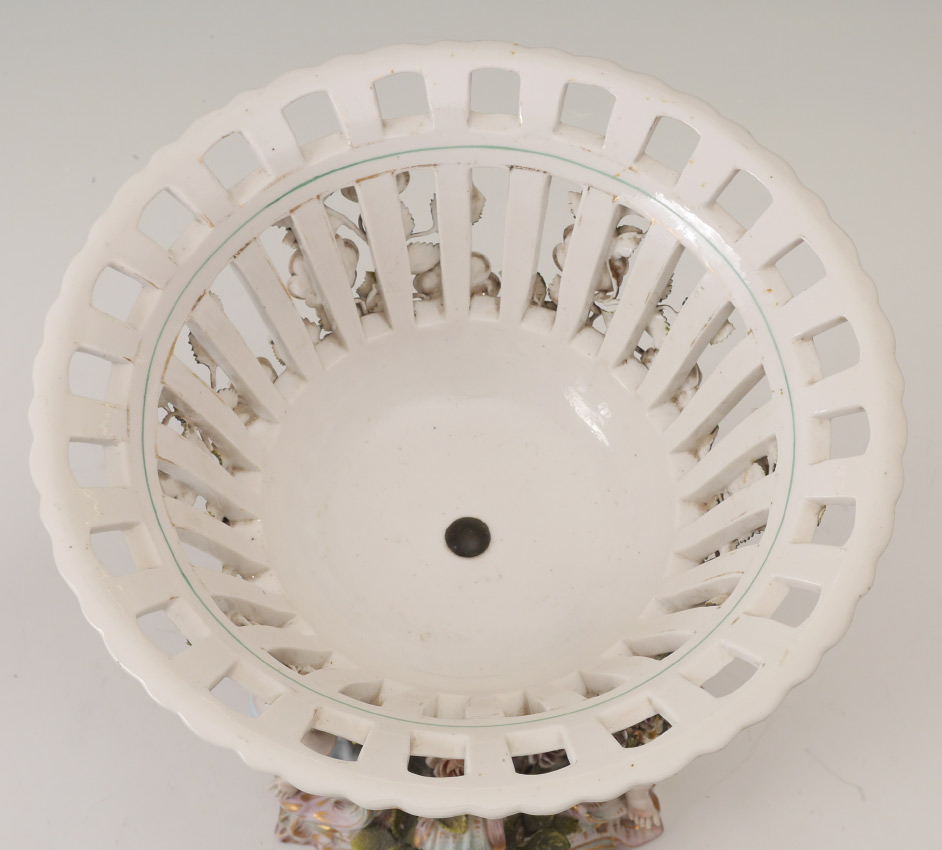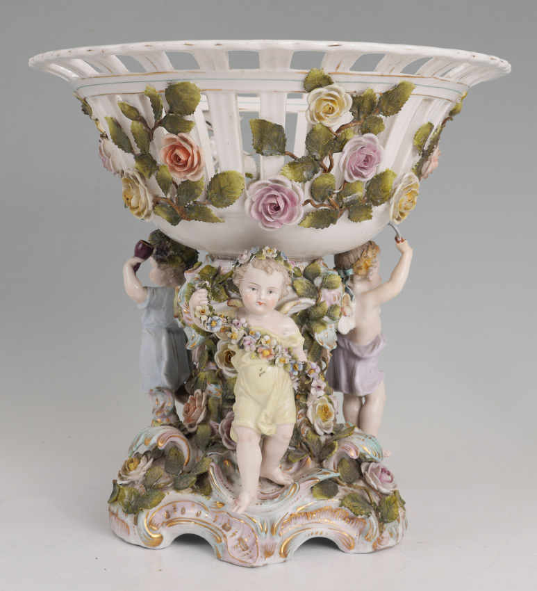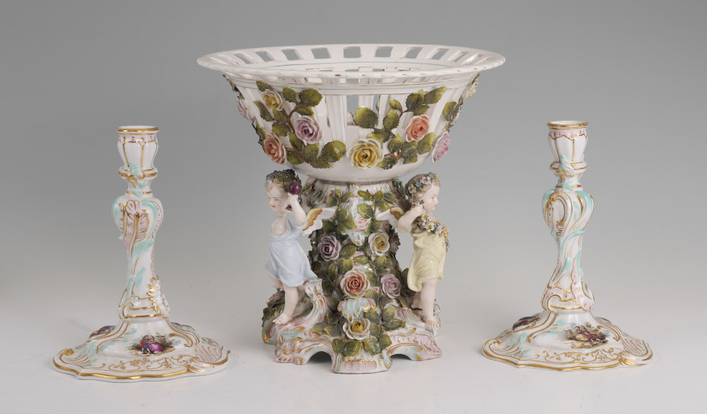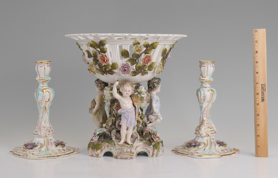 3 PIECE MEISSEN STYLE PORCELAIN CONSOLE SET: An assembled 3 pieces total to include 1) Center piece with reticulated bowl, 3 figural winged angels and applied floral decoration. Only mark visible is the number 14, measures 11 3/4'' h. x 12'' dia. 2-3) Pair of candlesticks with transfer decorated scenes. Unknown gilt mark on base.