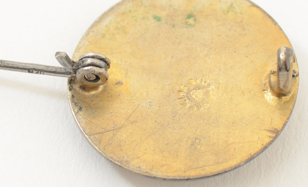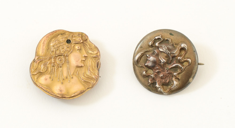UNGER BROTHER ART NOUVEAU MAIDEN STERLING PIN: 2 pieces total to include 1) Sterling pin with figural art nouveau maidens bust, signed with Unger Brother mark, 3/4'' dia. 2) Gold toned figural art nouveau maiden bust, unmarked as to maker or metal content, 3/4'' dia.
