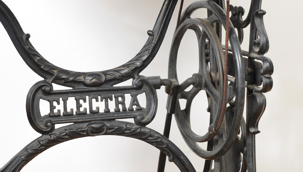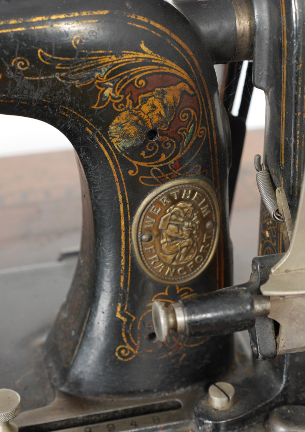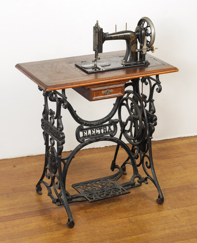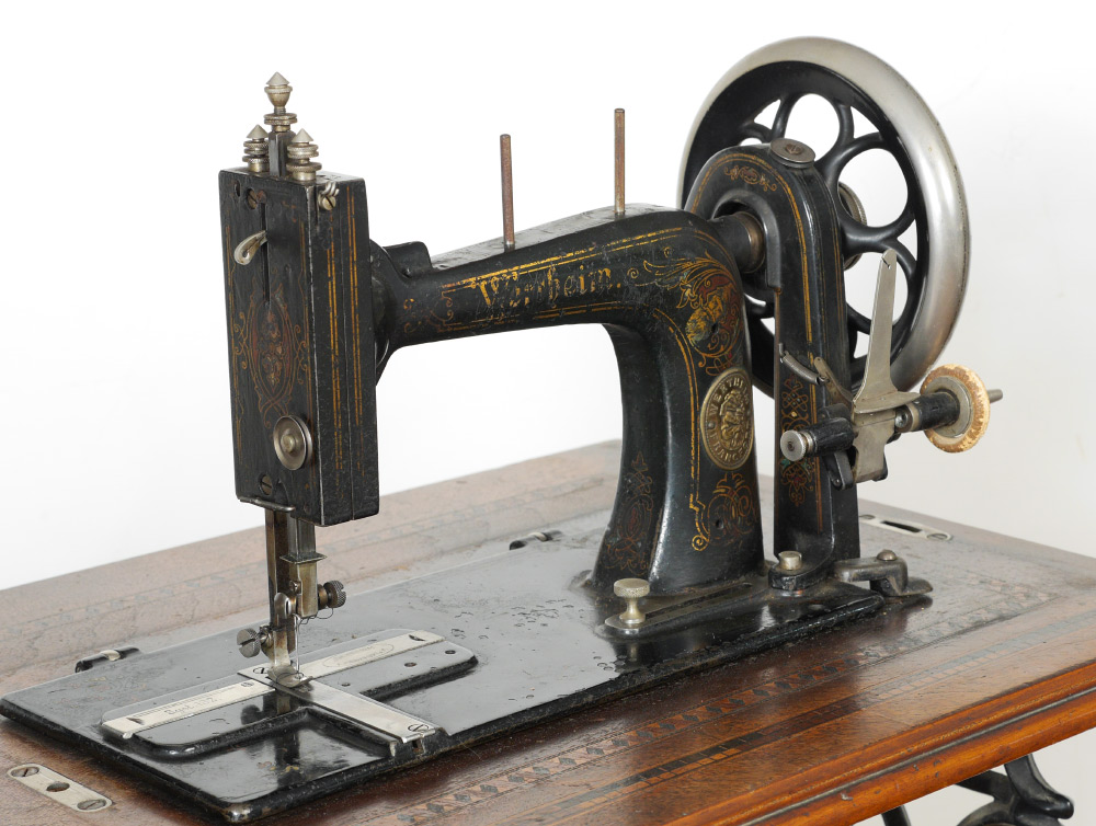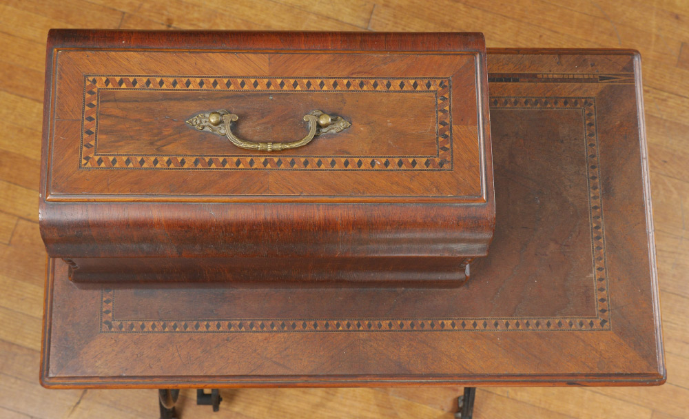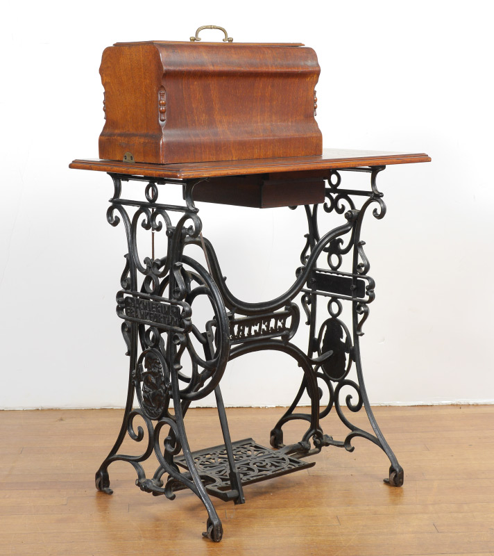 GERMAN WERTHEIM SEWING MACHINE ON STAND: Parquetry inlaid case and top of table, single drawer when opened unlocks case top to reveal the Wertheim black enamel pedal powered sewing machine with floral designs. Cast iron base with dwarves holding hammers in medallion decoration marked J Knierim, Frankfurt and Electha, all on castors. Overall measures 40 1/2'' h. x 29'' x 16 3/4''.