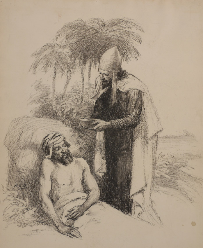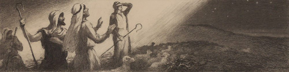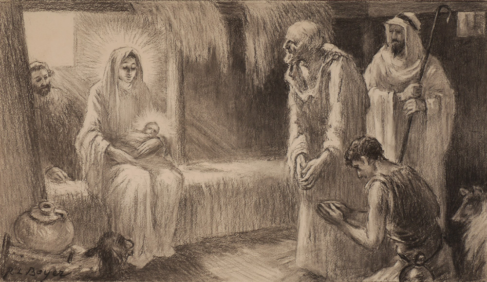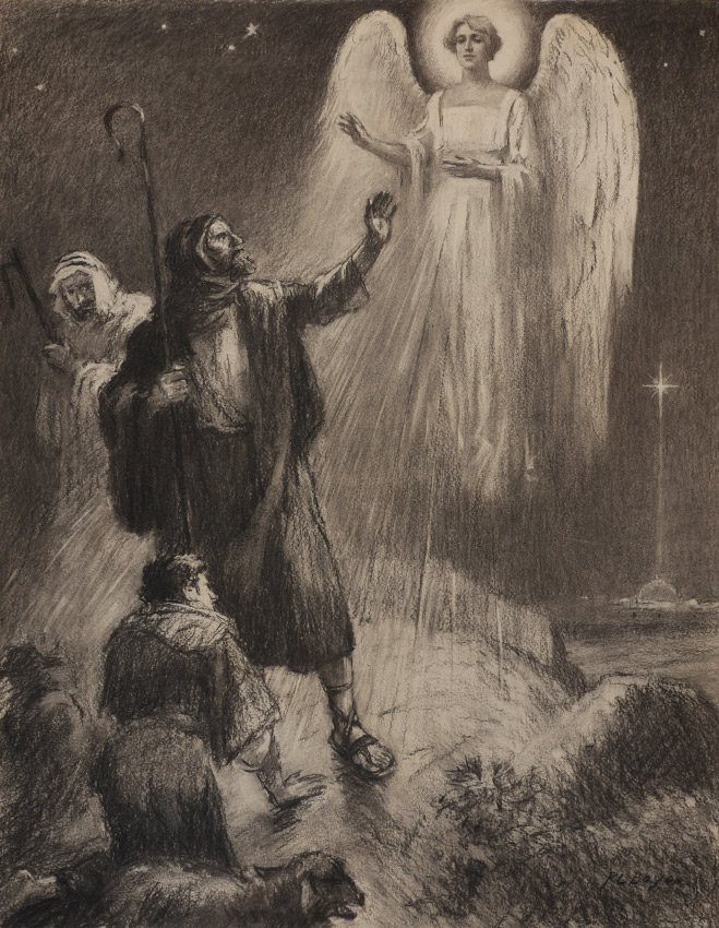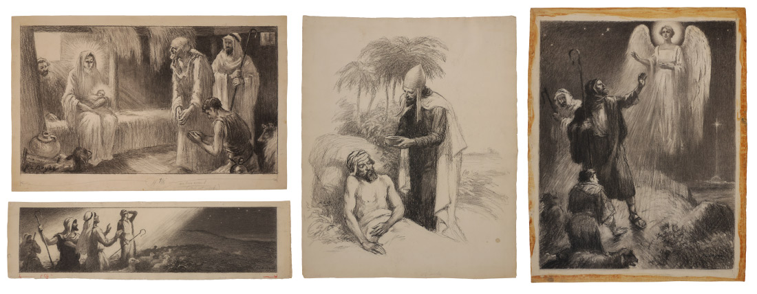 BOYER, Ralph Ludwig (American, 1879-1952): 1) Shepherds Blinded by a Bright Light, Illustration, 6.75'' x 28'', pencil signed lower right, 8'' x 31.25'' with margins; 2) Manger Scene with New Born Christ, image size 15.25'' x 20.5'', 18.25'' x 37'', signed lower left; 3) Angel Appearing, image size 25.75'' x 19'', signed lower right, 30.5'' x 22''; 4) Apostle Bringing Water to the Injured Prince, 24'' x 20'', signed lower left, paper is 28.5'' x 22''. All sizes are approximate.