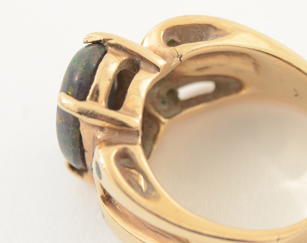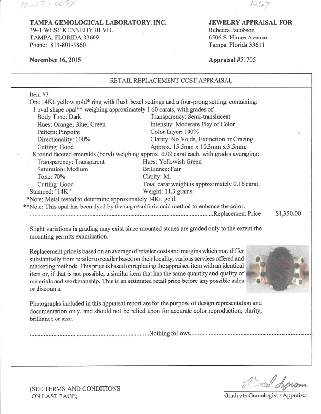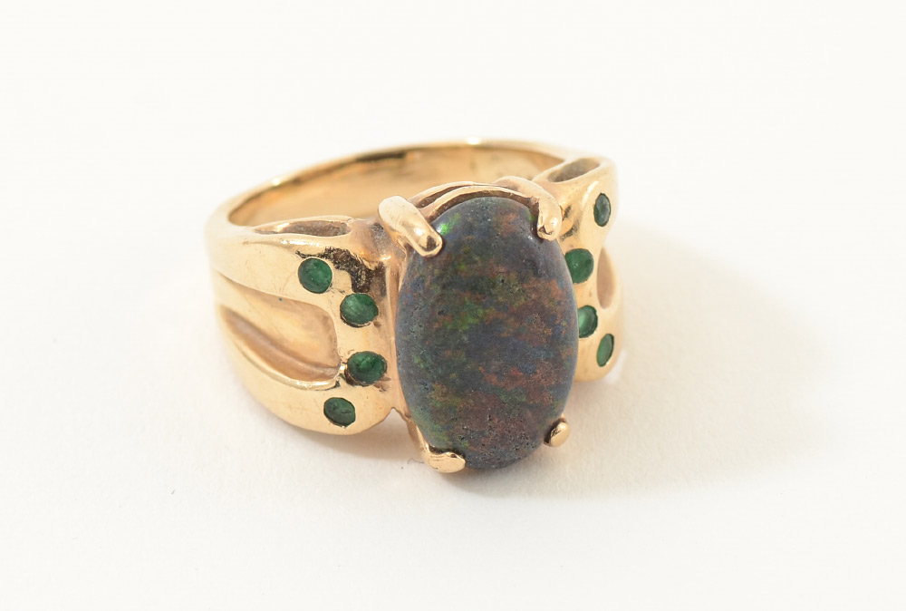1.60CT OPAL IN 14K GOLD RING WITH EMERALDS: Large opal with orange, blue and green hues is perfectly accented with 8 round faceted emeralds. Size 7.75. Total weight 11.3 grams. Sold with current Tampa Gemological Laboratory appraisal for $1350.