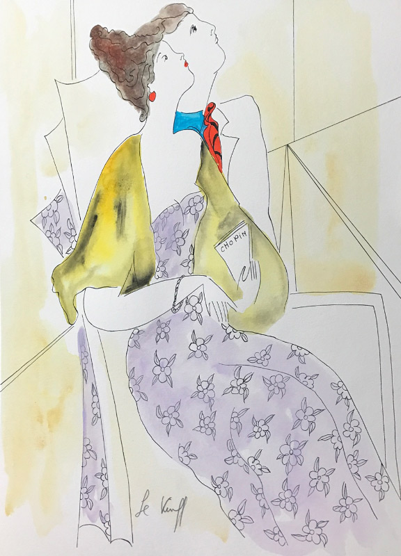 LE KNIFF, Linda (French, 1949-): ''Listening to Chopin'', Pen and Ink with Watercolor, 19.625'' x 16.25'', signed in lower margin, unframed.