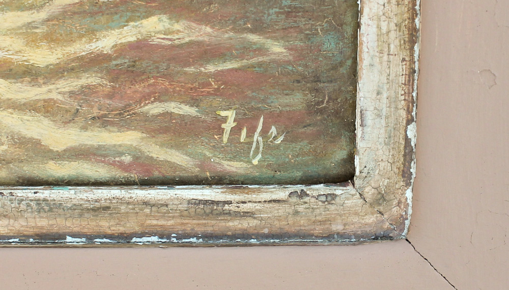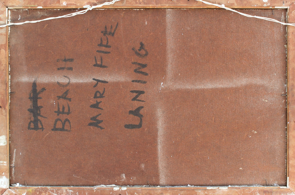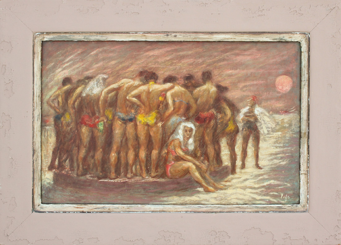 FIFE, Mary, (American, 1898-1990): Beach Scene with multiple figures Huddled, Oil/Masonite, 14'' x 22'', signed lower right, painted distressed frame, 20.5'' x 28.5'', inscribed verso.