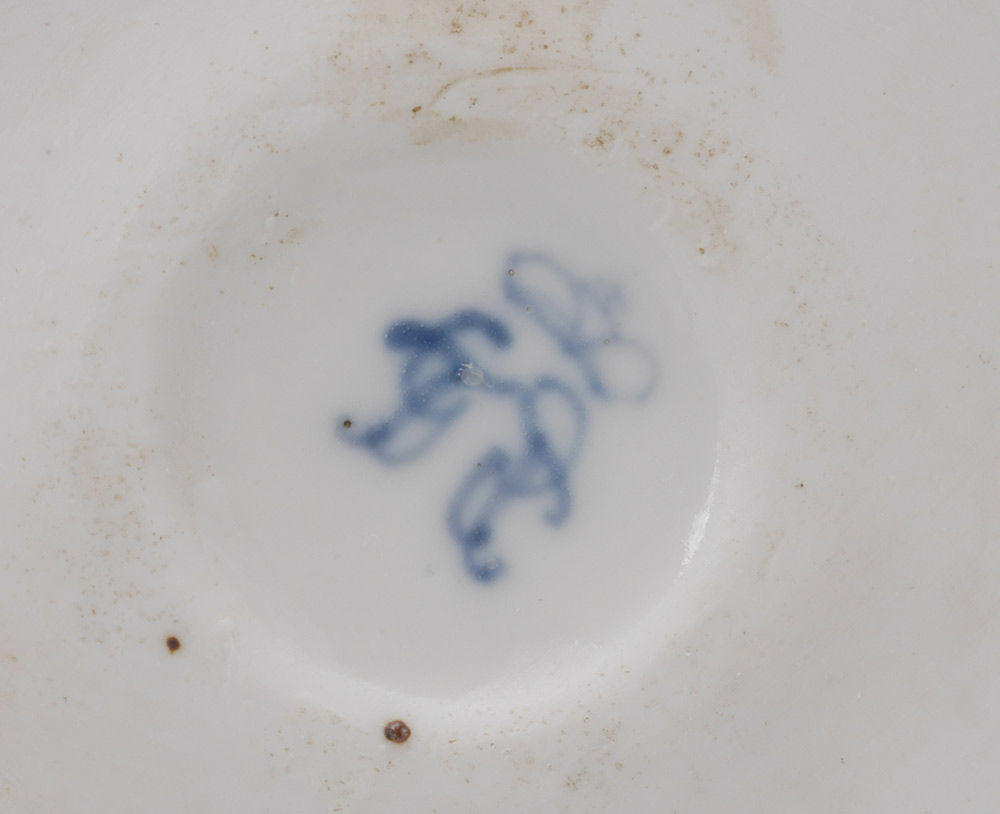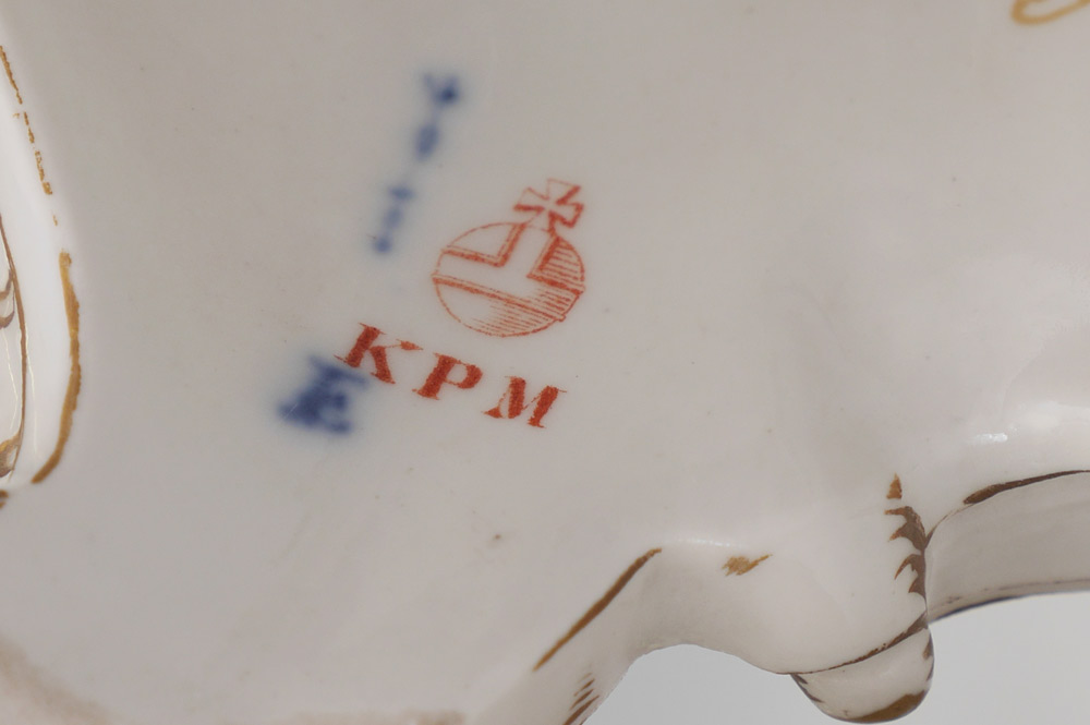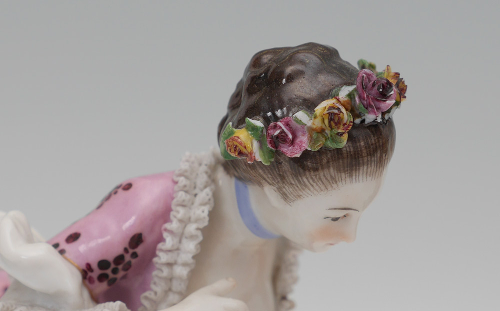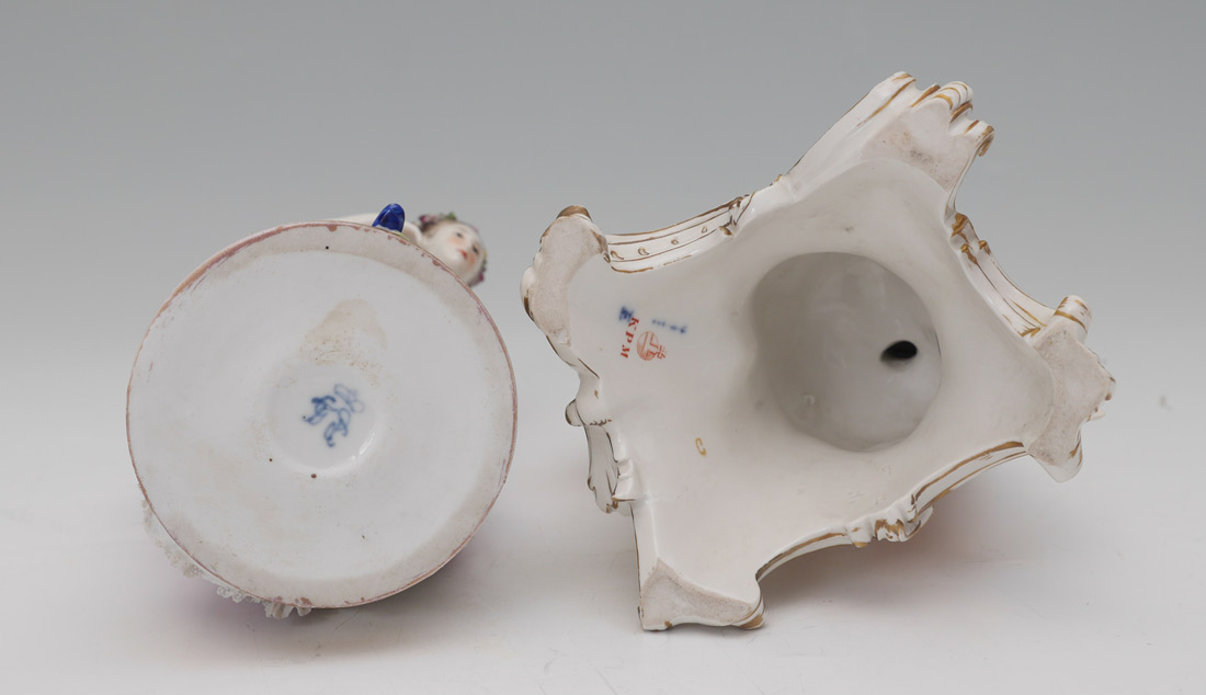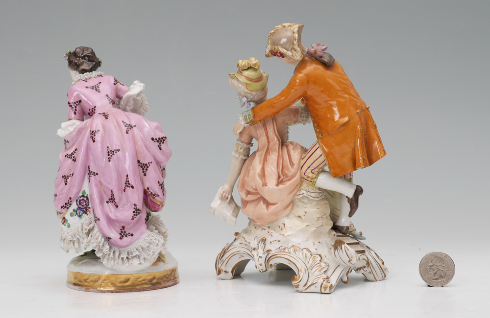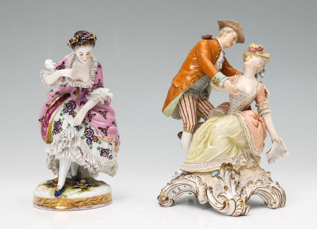 GERMAN KPM & VOLKSTEDT PORCELAIN FIGURES: 2 Pieces total to include 1) KPM figural group of 2 lovers with lace trim, marked in base with blue scepter and red KPM mark, measures 7'' h. x 5 1/2'' x 4 1/4''. 2) Volkstedt lacy figure, Blue mark on base, 6 1/4'' h. x 3 3/4''.