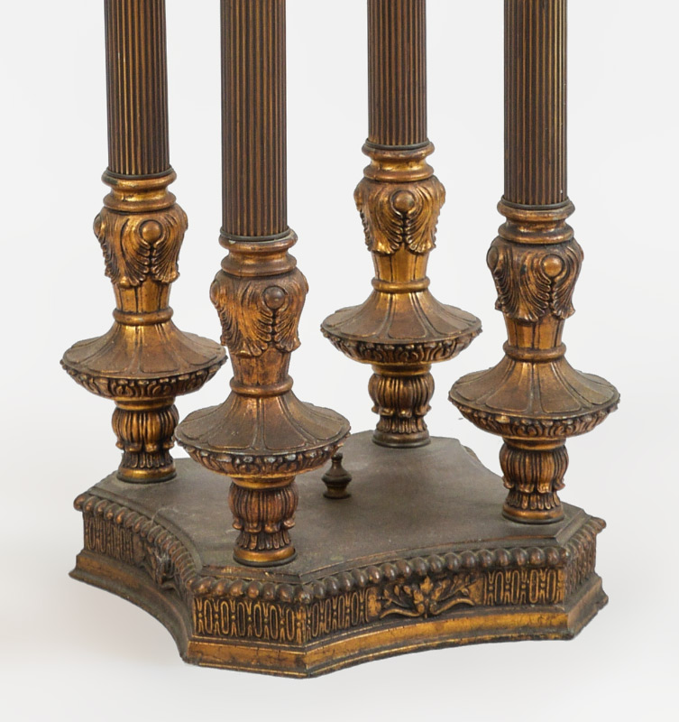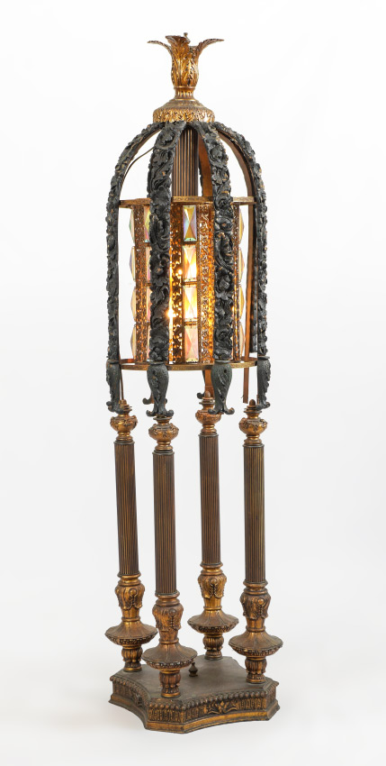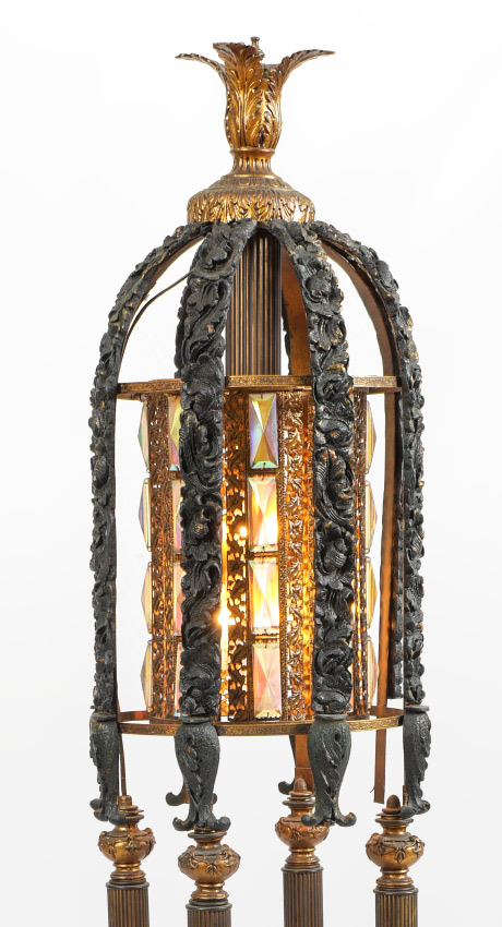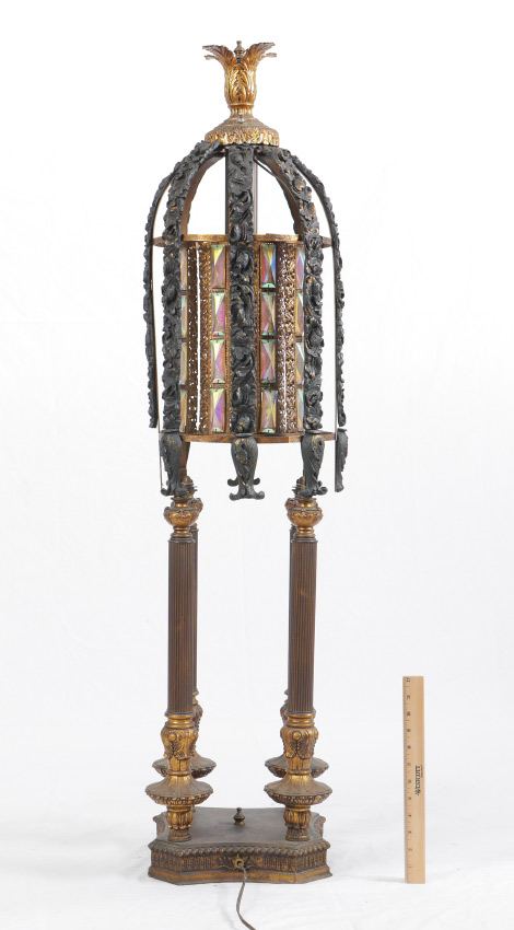 STANDING MOSQUE FLOOR LAMP: Mixed metal floor lamp in the Persian style, center shade with pierced metal gold toned panels, iridescent glass ''jewels'', 4 socket fixture. Outer support with applied carved wood accents, fluted columns. Overall measures 49 1/2'' h. x 14 1/2'' dia.