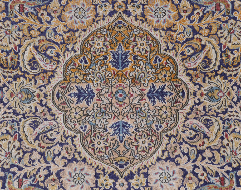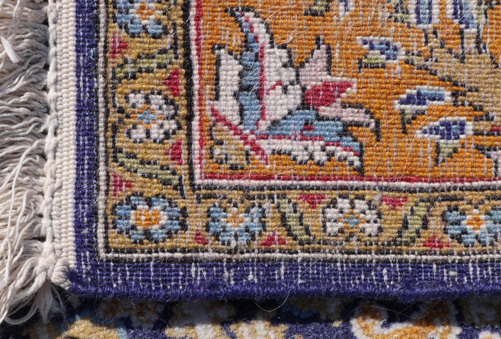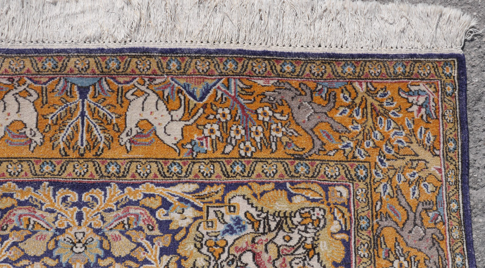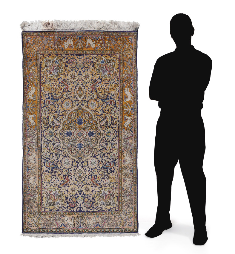 APPROX. 20/35 YR OLD INDO-PERSIAN HAND KNOTTED WOOL RUG, 3'4'' X 5'1'': An animal and bird pattern rug with an ovoid central medallion that is mostly pastel colors. The field and border is interspersed with animals and birds. The field changes color from a pale to deep gold.