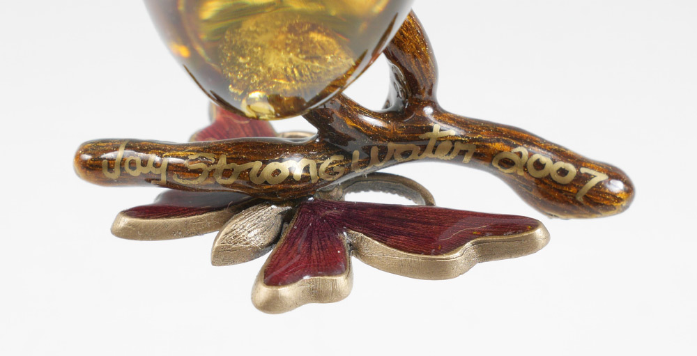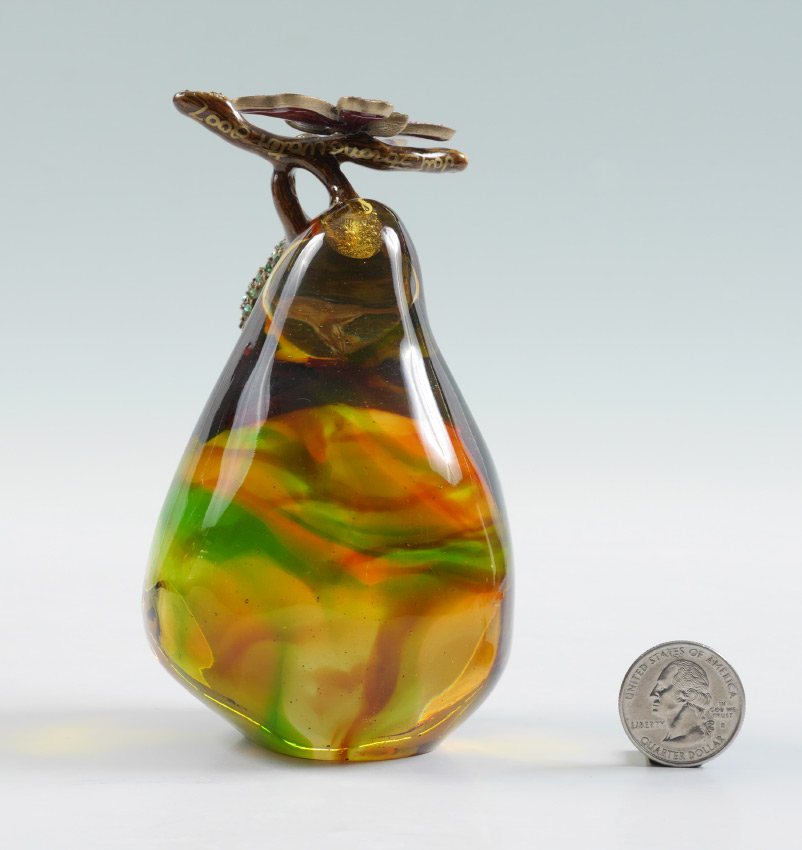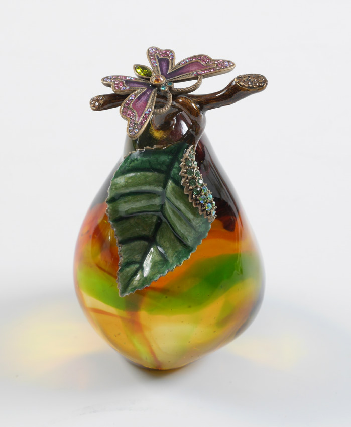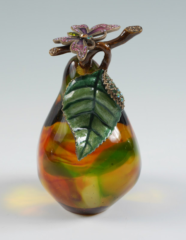 2007 JAY STRONGWATER GLASS PEAR WITH BUTTERFLY: Signed Jay Strongwater and dated 2007 on stem, mottled glass pear with enameled butterfly and leaf with crystal accents, original tag. Measures 5'' h. x 3''.