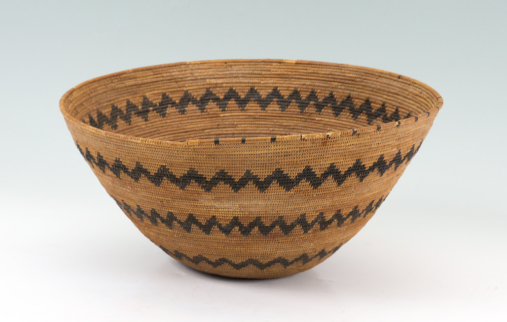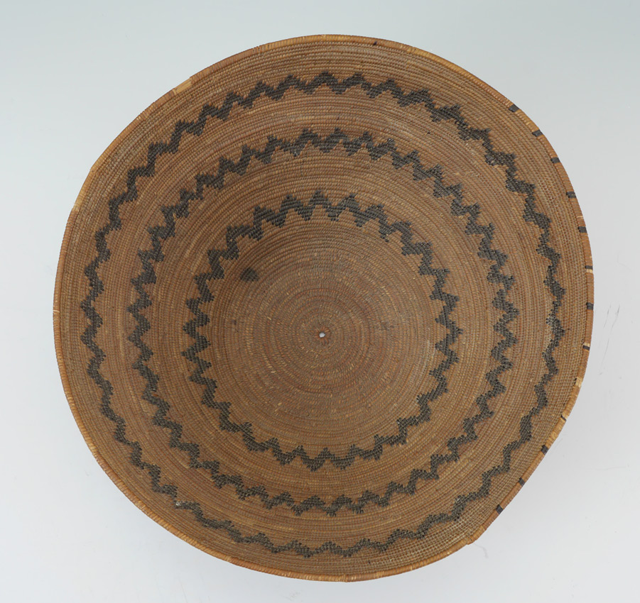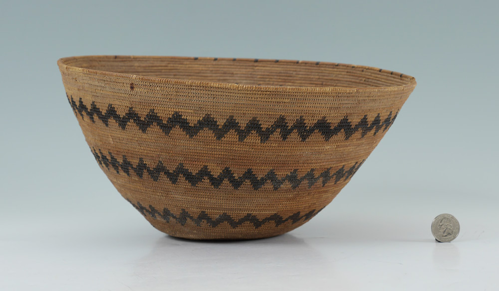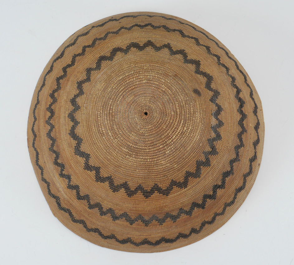 SOUTHWEST NATIVE AMERICAN WOVEN BASKET: Tight weave with 3 zigzag rings, open center hole, finished rim, possibly California? Overall measures 6'' h. x 12 1/2''.