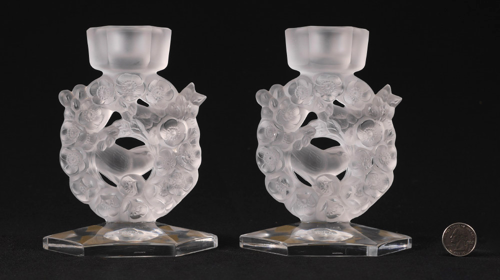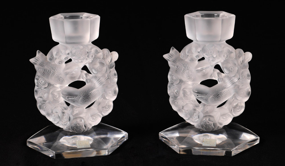PAIR OF LALIQUE MESANGES BIRD CANDLESTICKS: Frosted crystal bodies with bird in wreath motif, clear foot, signed Lalique France with original labels, 6 1/2'' h. x 5''.