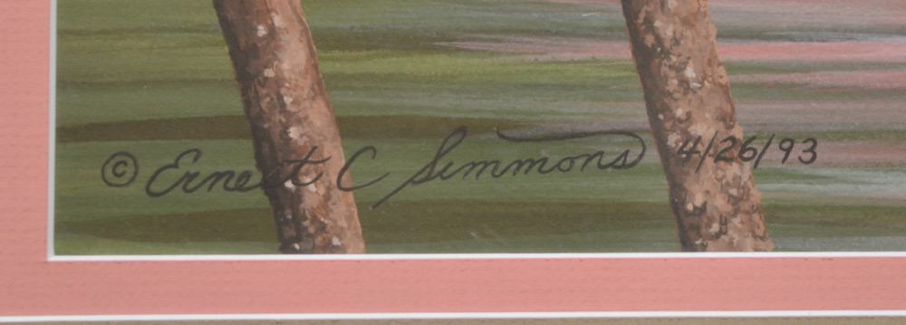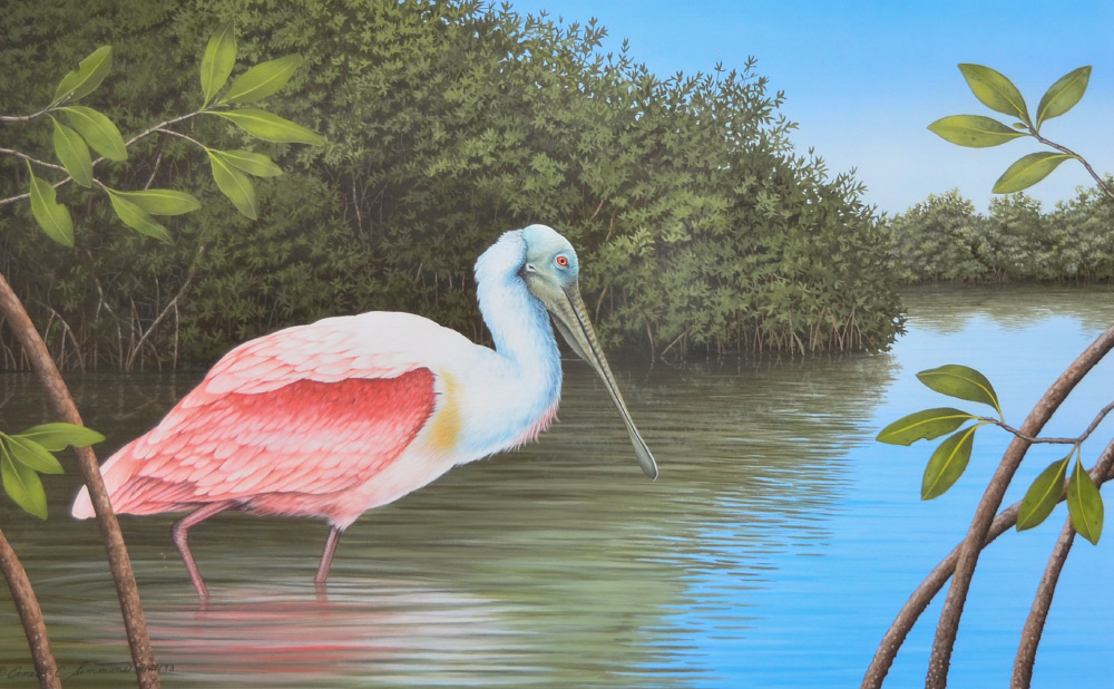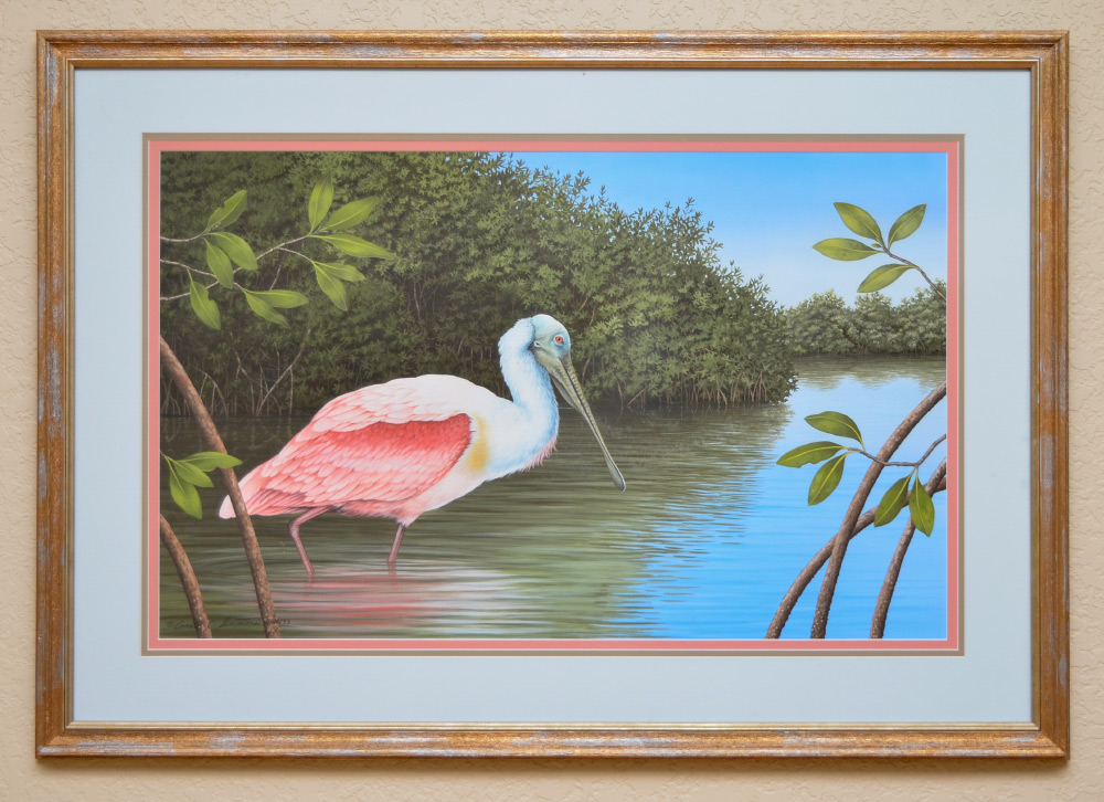 SIMMONS, Ernest C., (American, 20th Century): Roseate Spoonbill in Shallow Water with Mangroves, Gouache, sight size 18 1/4'' x 29'', signed lower left and dated 1993, custom frame, 27 1/2'' x 38 1/2''.