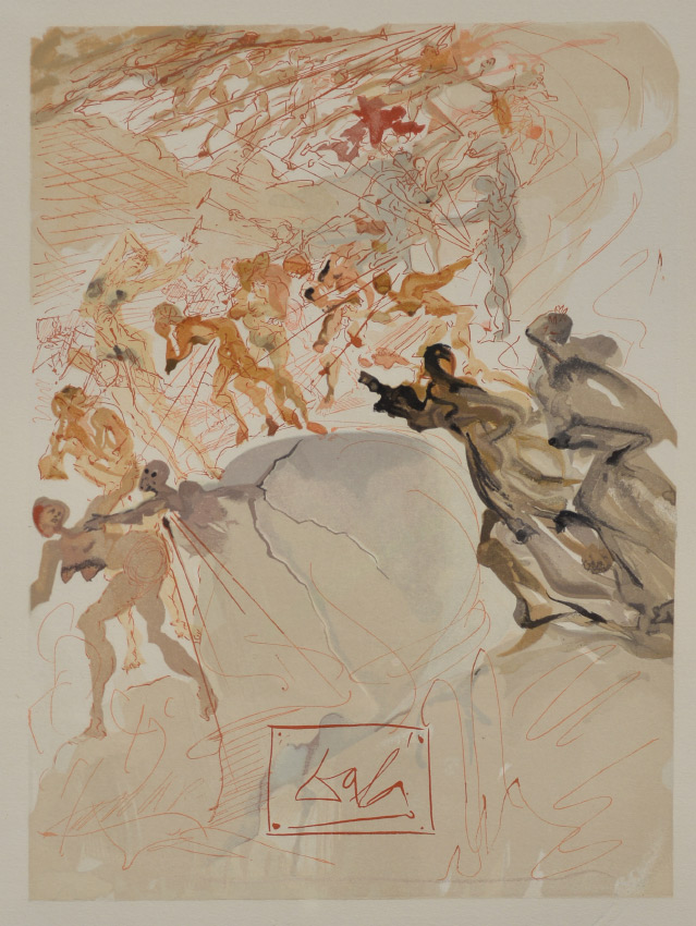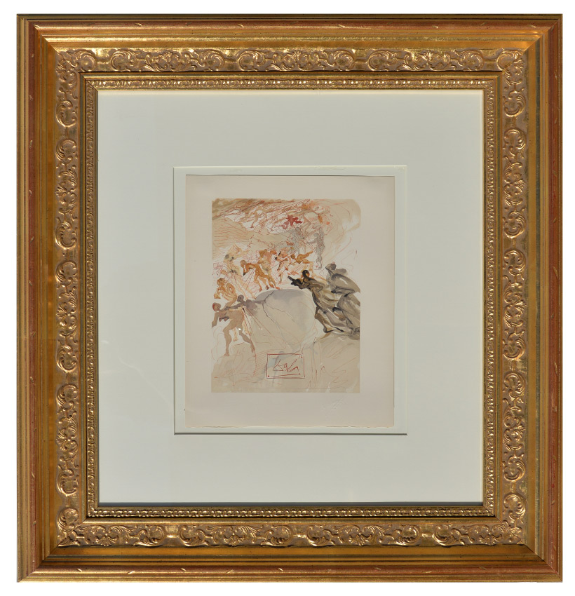 SALVADOR DALI DIVINE COMEDY WOOD ENGRAVING PURGATORY CANTO #25: 13'' x 10.25'', signed in the plate lower margin, blind stamp lower right, framed, 30'' x 26.25''. Park West Gallery affixed verso.