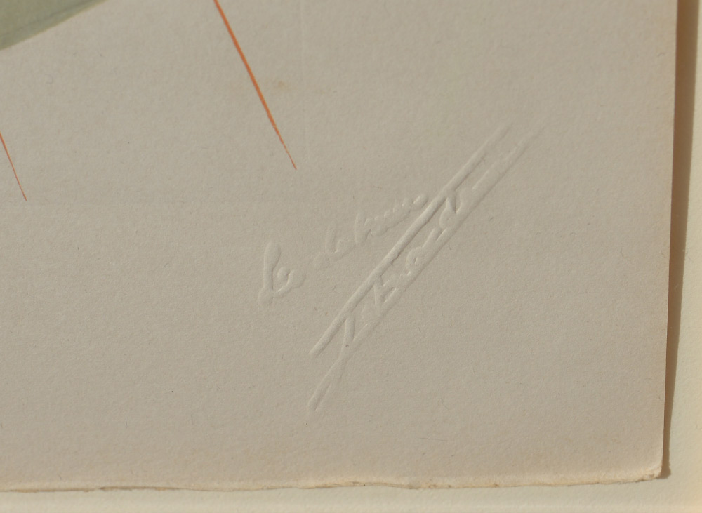 CONDITION: Float mounted in frame, visible handling crease, some minor staining along lower left corner and margin, frame shows wear, sold as is.